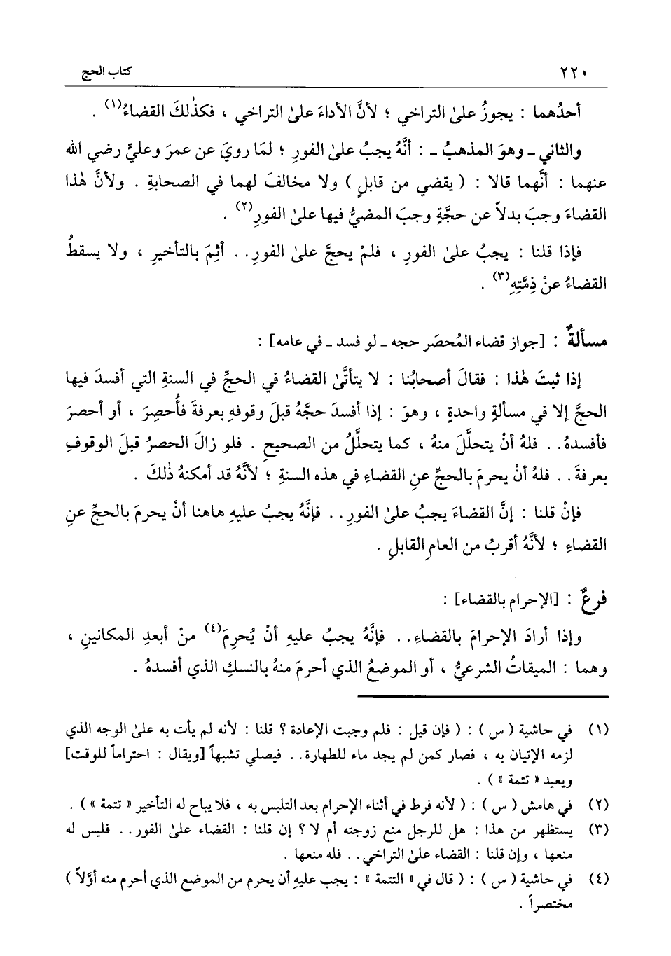 والثاني - وهو المذهب -: أنه يجب على الفور؛ لما روي عن عمر وعلي - رَضِيَ اللَّهُ عَنْهُمَا -: أنهما قالا: (يقضي من قابل) ولا مخالف لهما في الصحابة. ولأن هذا القضاء وجب بدلا عن حجة وجب المضي فيها على الفور.