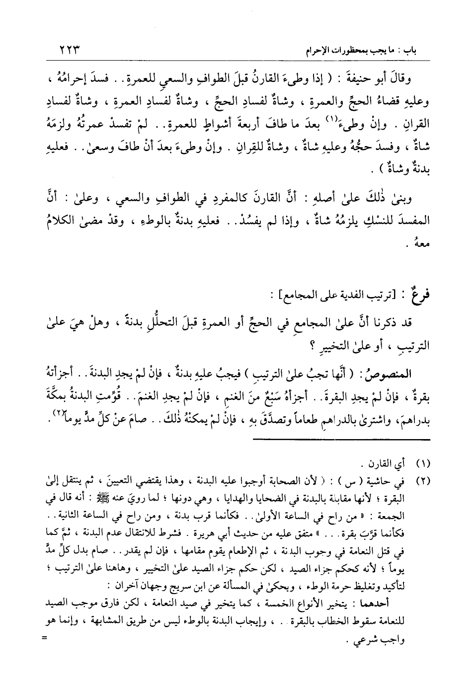 وقال أبو حنيفة: (إذا وطئ، القارن قبل الطواف والسعي للعمرة.. فسد إحرامه وعليه قضاء الحج والعمرة، وشاة لفساد الحج، وشاة لفساد العمرة، وشاة لفساد القران. وإن وطئ بعد ما طاف أربعة أشواط للعمرة.. لم تفسد عمرته ولزمه شاة، وفسد حجه وعليه شاة، وشاة للقران. وإن وطئ بعد أن طاف وسعى.. فعليه بدنة وشاة) .