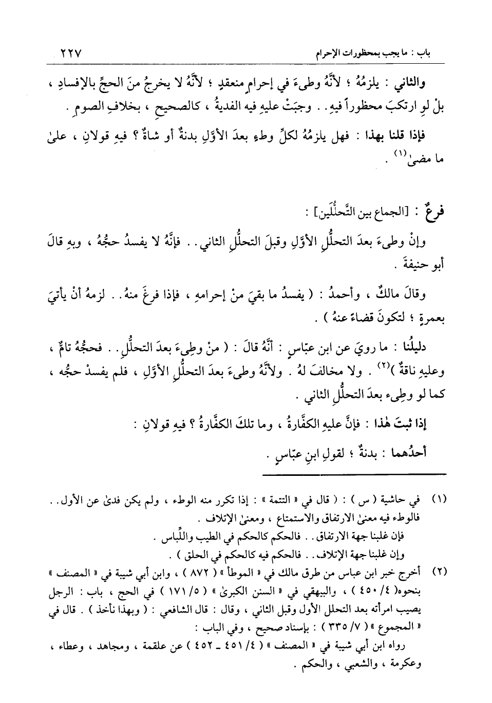 دليلنا: ما روي عن ابن عباس: أنه قال: (من وطئ بعد التحلل.. فحجه تام وعليه ناقة) ، ولا مخالف له ولأنه وطئ بعد التحلل الأول، فلم يفسد حجه، كما لو وطئ بعد التحلل الثاني.