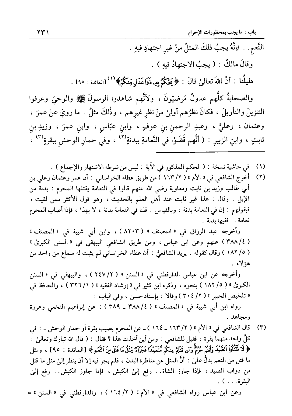 والصحابة كلهم عدول مرضيون، ولأنهم شاهدوا الرسول - صَلَّى اللَّهُ عَلَيْهِ وَسَلَّمَ - والوحي وعرفوا التنزيل والتأويل، فكان نظرهم أولى من نظر غيرهم، وذلك مثل: ما روي عن عمر، وعثمان، وعلي، وعبد الرحمن بن عوف، وابن عباس، وابن عمر، وزيد بن ثابت، وابن الزبير: (أنهم قضوا في النعامة ببدنة، وفي حمار الوحش ببقرة) ،