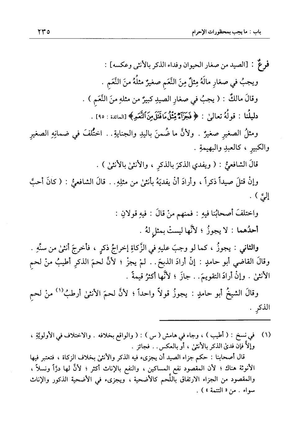 [فرع الصيد من صغار الحيوان وفداء الذكر بالأنثى وعكسه]