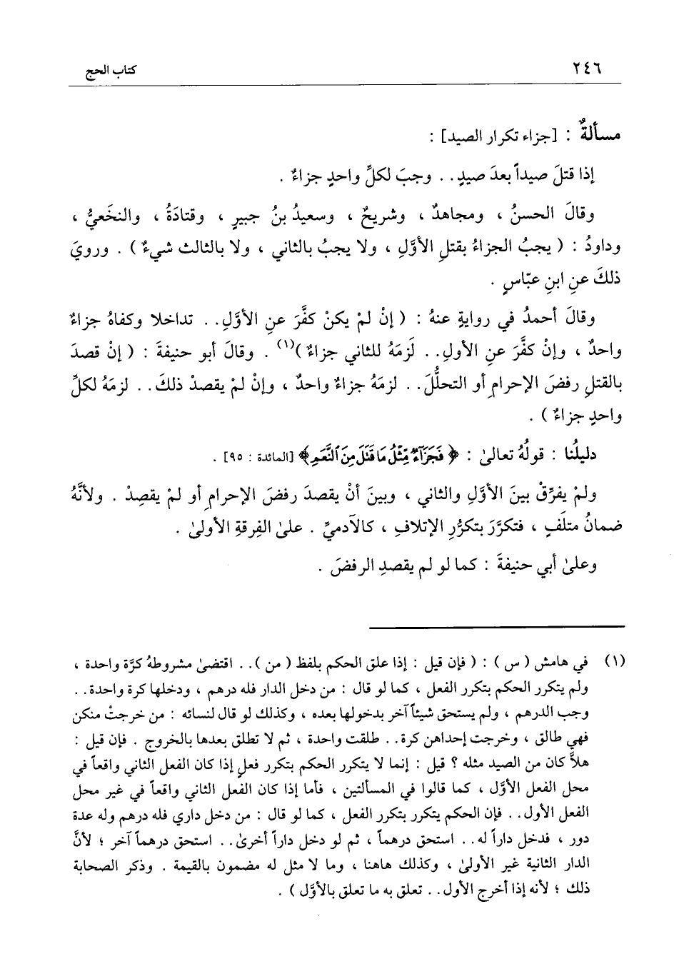 وقال أحمد في رواية عنه: (إن لم يكن كفر عن الأول.. تداخلا وكفاه جزاء واحد، وإن كفر عن الأول.... لزمه للثاني جزاء) . وقال أبو حنيفة: (إن قصد بالقتل رفض الإحرام أو التحلل.. لزمه جزاء واحد، وإن لم يقصد ذلك.. لزمه لكل واحد جزاء) دليلنا: قَوْله تَعَالَى: {فَجَزَاءٌ مِثْلُ مَا قَتَلَ مِنَ النَّعَمِ} [المائدة: 95] [المائدة: 95] .