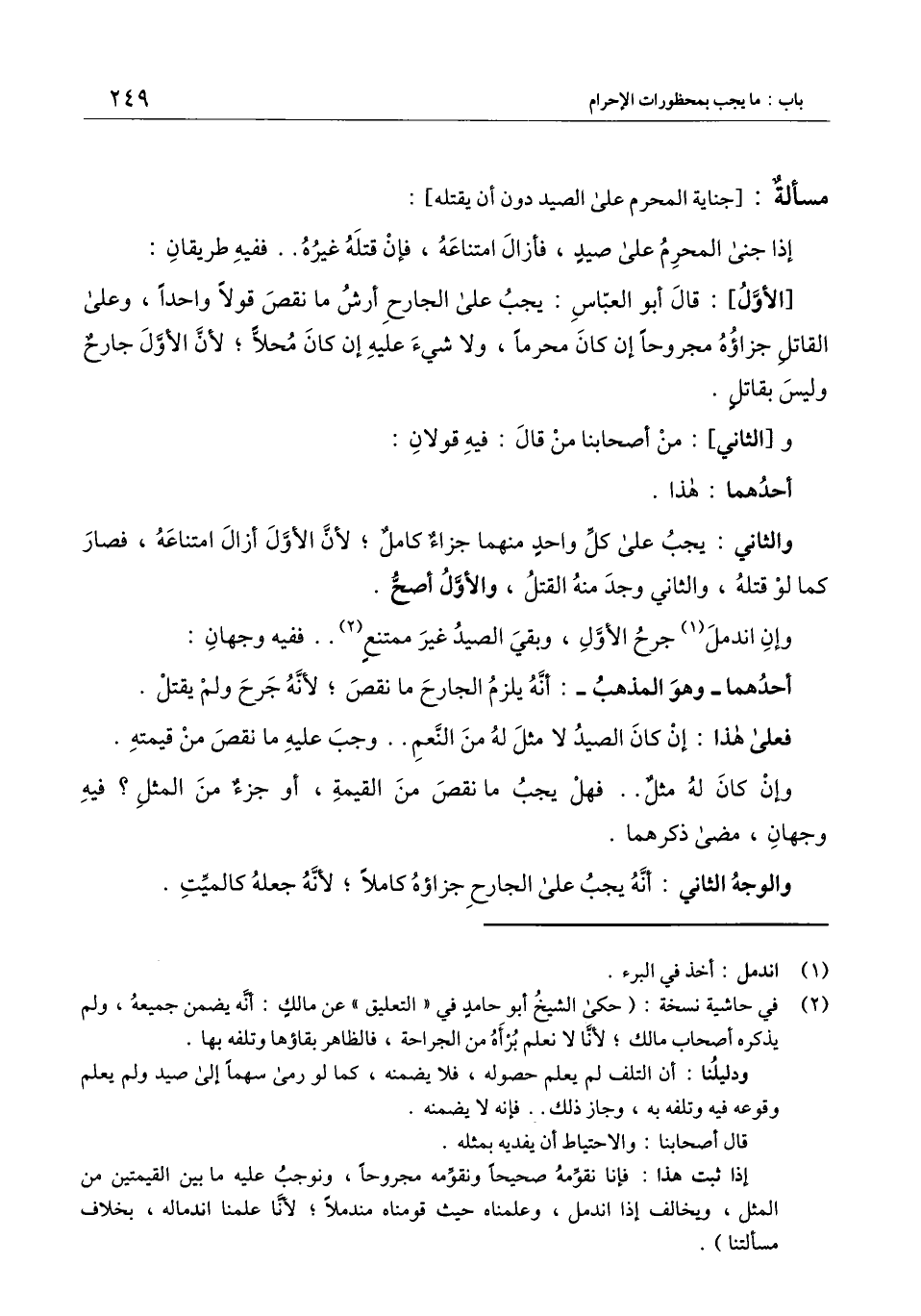 [الأول] : قال أبو العباس: يجب على الجارح أرش ما نقص قولا واحدا، وعلى القاتل جزاؤه مجروحا إن كان محرما، ولا شيء عليه إن كان محلا؛ لأن الأول جارح وليس بقاتل.