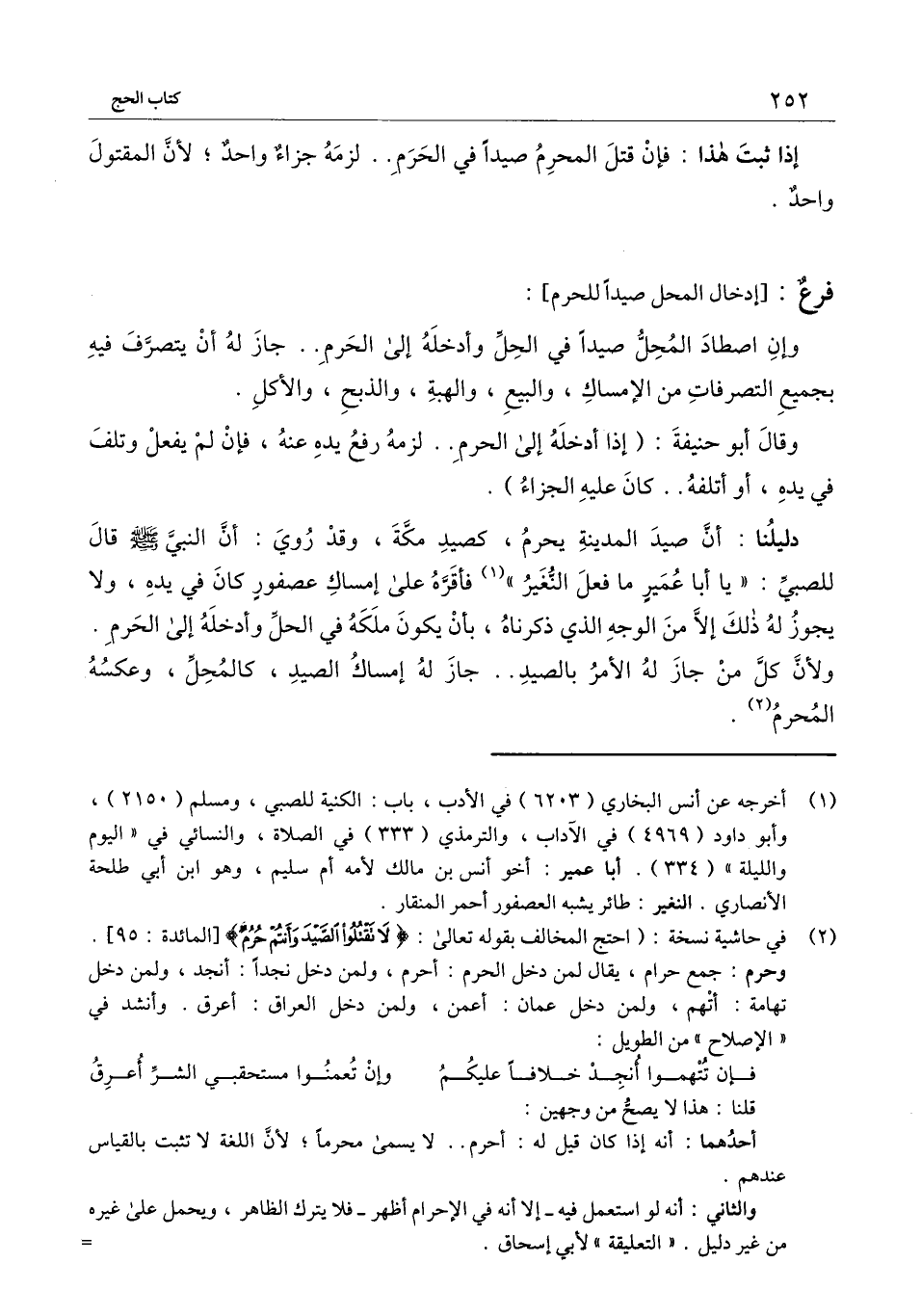 دليلنا: أن صيد المدينة يحرم، كصيد مكة، وقد روي: أن النبي - صَلَّى اللَّهُ عَلَيْهِ وَسَلَّمَ - قال للصبي: «يا أبا عمير ما فعل النغير» فأقره على إمساك عصفور كان في يده، ولا يجوز له ذلك إلا من الوجه الذي ذكرناه، بأن يكون ملكه في الحل وأدخله إلى الحرم.