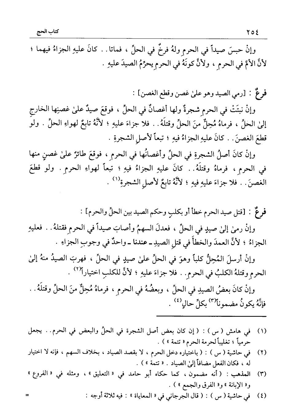 وإن نبتت في الحرم شجرة ولها أغصان في الحل، فوقع صيد على غصنها الخارج إلى الحل، فرماه محل من الحل وقتله..... فلا جزاء عليه؛ لأنه تابع لهواء الحل. ولو قطع الغصن.. كان عليه الجزاء فيه؛ تبعا لأصل الشجرة.