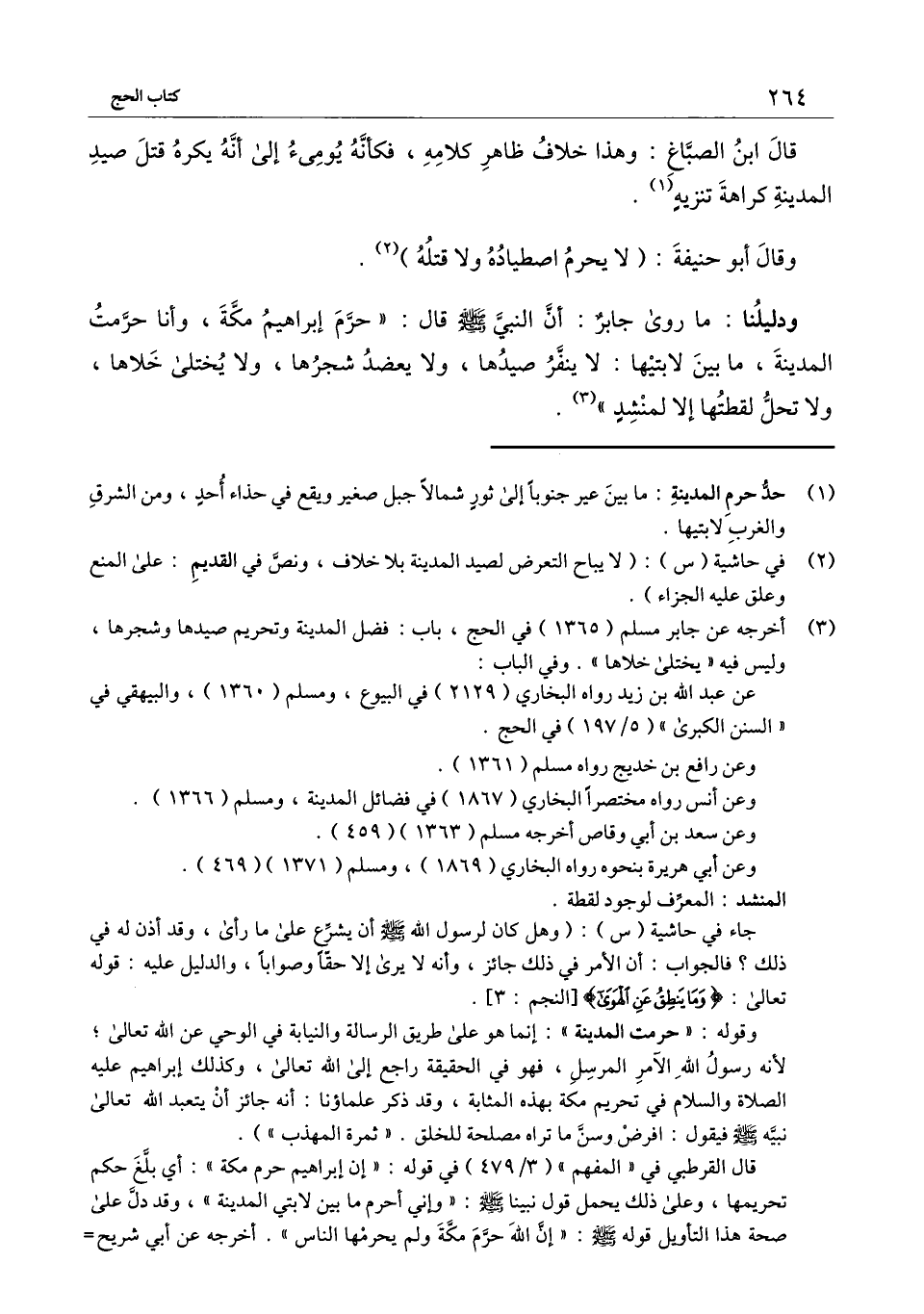 ودليلنا: ما روى جابر: أن النبي ـ - صَلَّى اللَّهُ عَلَيْهِ وَسَلَّمَ - ـ قال: «حرم إبراهيم مكة، وأنا حرمت المدينة، ما بين لابتيها: لا ينفر صيدها، ولا يعضد شجرها، ولا يختلى خلاها، ولا تحل لقطتها إلا لمنشد» .