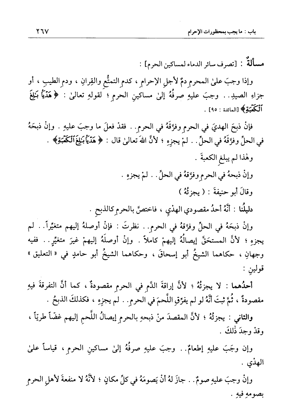 ] : وإذا وجب على المحرم دم لأجل الإحرام، كدم التمتع والقران، ودم الطيب، أو جزاء الصيد.. وجب عليه صرفه إلى مساكين الحرم؛ لِقَوْلِهِ تَعَالَى: {هَدْيًا بَالِغَ الْكَعْبَةِ} [المائدة: 95] [المائدة: 95] .