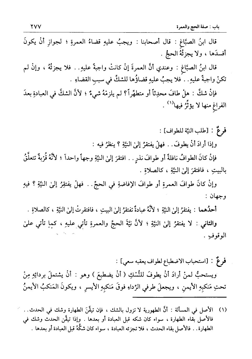وإن كان طواف العمرة أو طواف الإفاضة في الحج.. فهل يفتقر إلى النية؟ فيه وجهان: