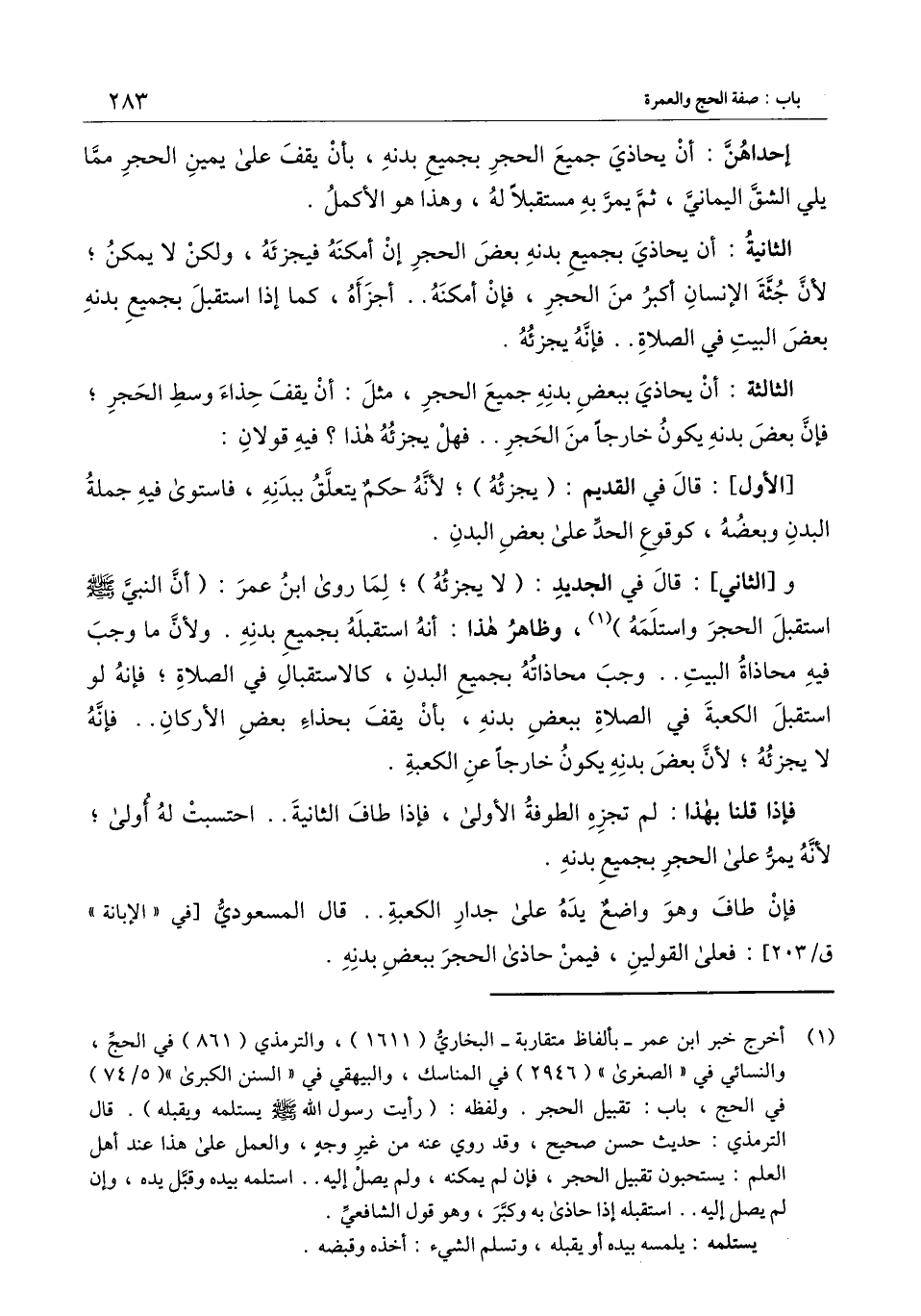 و (الثاني) : قال في الجديد: (لا يجزئه) ؛ لما روى ابن عمر: «أن النبي ـ - صَلَّى اللَّهُ عَلَيْهِ وَسَلَّمَ - ـ استقبل الحجر واستلمه» وظاهر هذا: أنه استقبله بجميع بدنه. ولأن ما وجب فيه محاذاة البيت.. وجب محاذاته بجميع البدن، كالاستقبال في الصلاة؛ فإنه لو استقبل الكعبة في الصلاة ببعض بدنه، بأن يقف بحذاء بعض الأركان.. فإنه لا يجزئه: لأن بعض بدنه يكون خارجا عن الكعبة.
