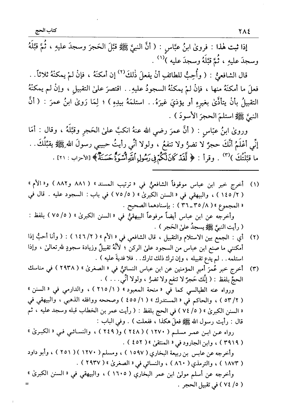 وروى ابن عباس: «أن عمر ـ - رَضِيَ اللَّهُ عَنْهُ - ـ انكب على الحجر وقبله، وقال: أما إني أعلم أنك حجر لا تضر ولا تنفع، ولولا أني رأيت حبيبي رسول الله ـ - صَلَّى اللَّهُ عَلَيْهِ وَسَلَّمَ - ـ يقبلك.. ما أقبلك) . وقرأ: {لَقَدْ كَانَ لَكُمْ فِي رَسُولِ اللَّهِ أُسْوَةٌ حَسَنَةٌ} [الأحزاب: 21] » [الأحزاب: 21] .