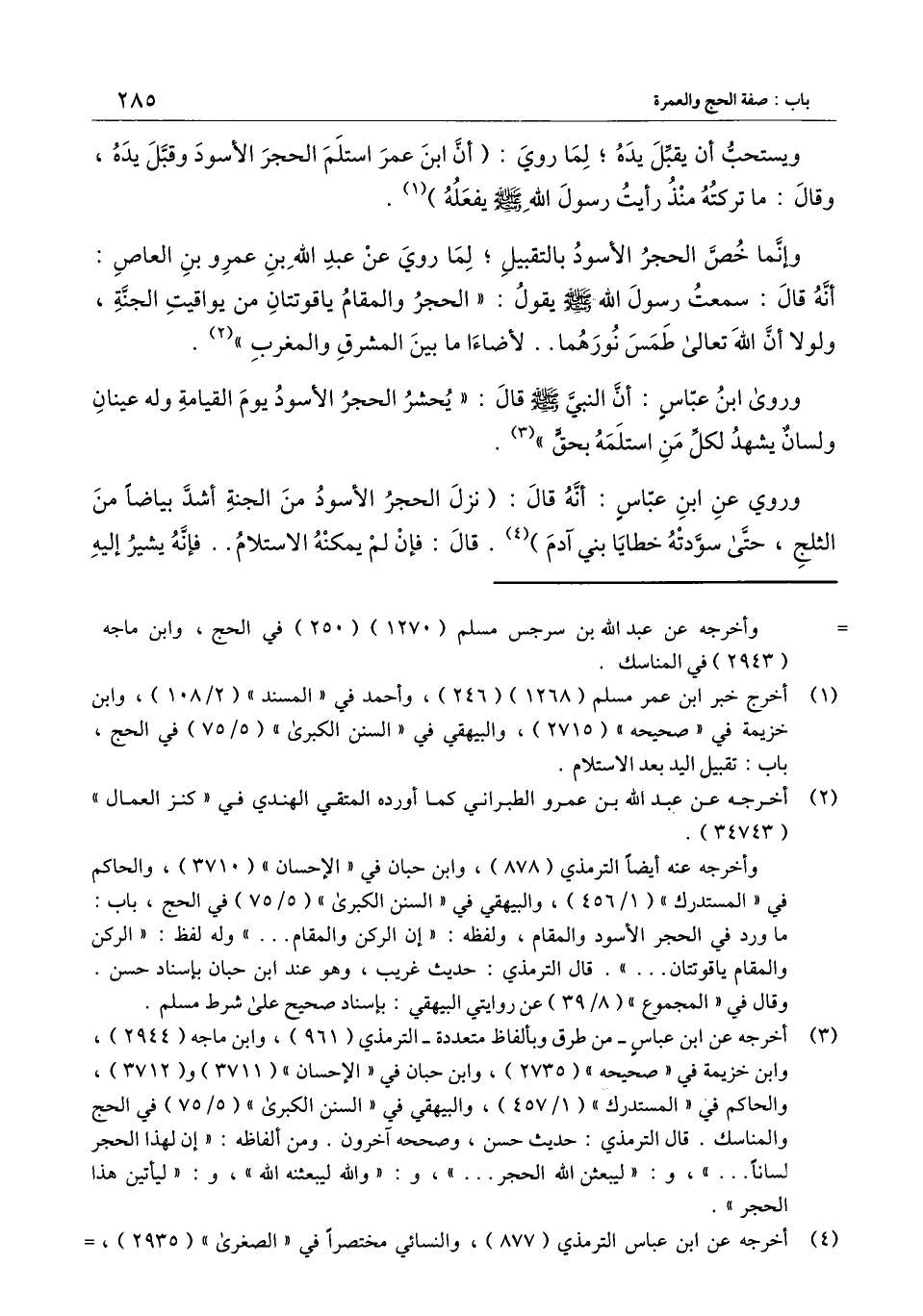 وإنما خص الحجر الأسود بالتقبيل: لما روي عن عبد الله بن عمرو بن العاص: أنه قال: سمعت رسول الله ـ - صَلَّى اللَّهُ عَلَيْهِ وَسَلَّمَ - ـ يقول: «الحجر والمقام ياقوتتان من يواقيت الجنة، ولولا أن الله تعالى طمس نورهما.. لأضاءا ما بين المشرق والمغرب» .