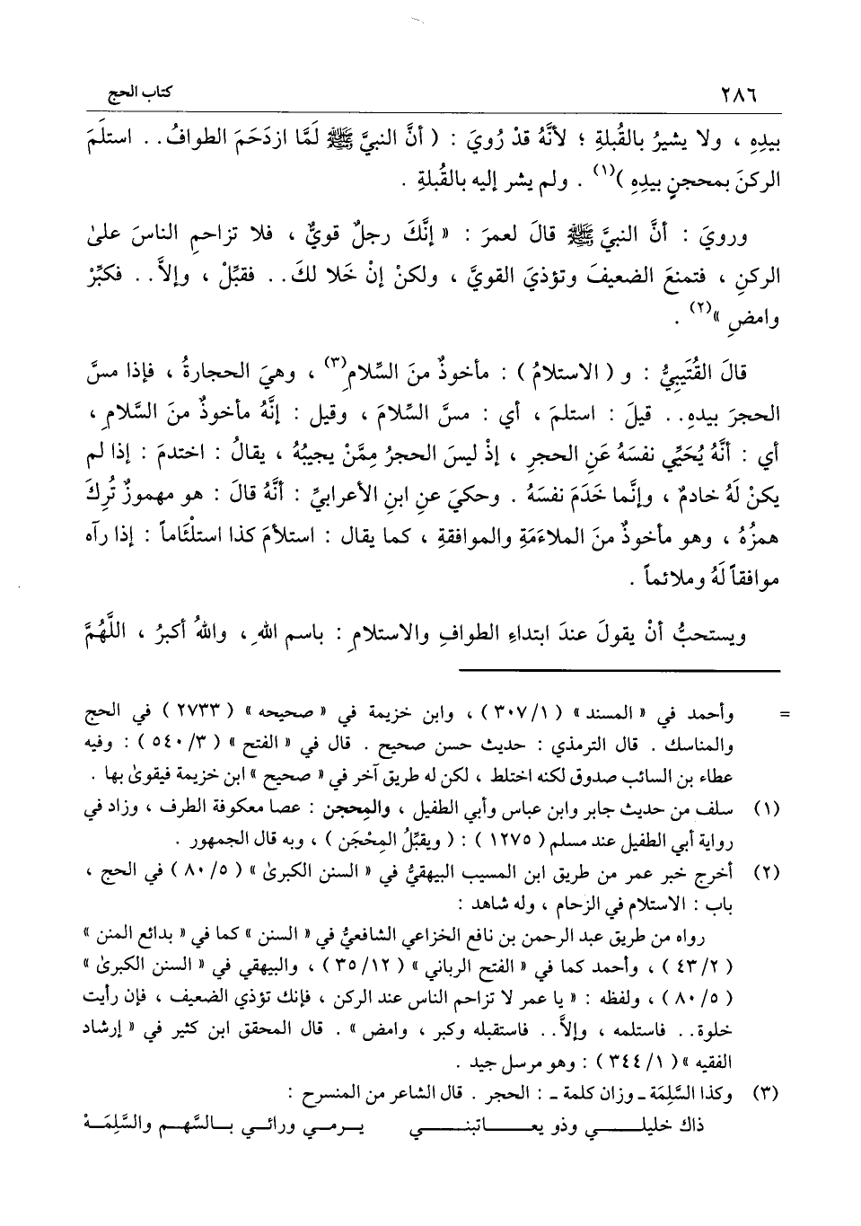 وروي: «أن النبي ـ - صَلَّى اللَّهُ عَلَيْهِ وَسَلَّمَ - ـ قال لعمر: " إنك رجل قوي، فلا تزاحم الناس على الركن، فتمنع الضعيف وتؤذي القوي، ولكن إن خلا لك.. فقبل، وإلا.. فكبر وامض» .