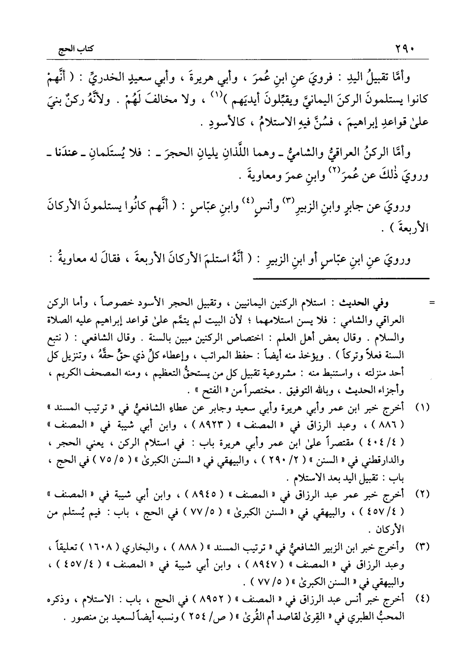 وروي عن جابر وابن الزبير وأنس وابن عباس: (أنهم كانوا يستلمون الأركان الأربعة) .