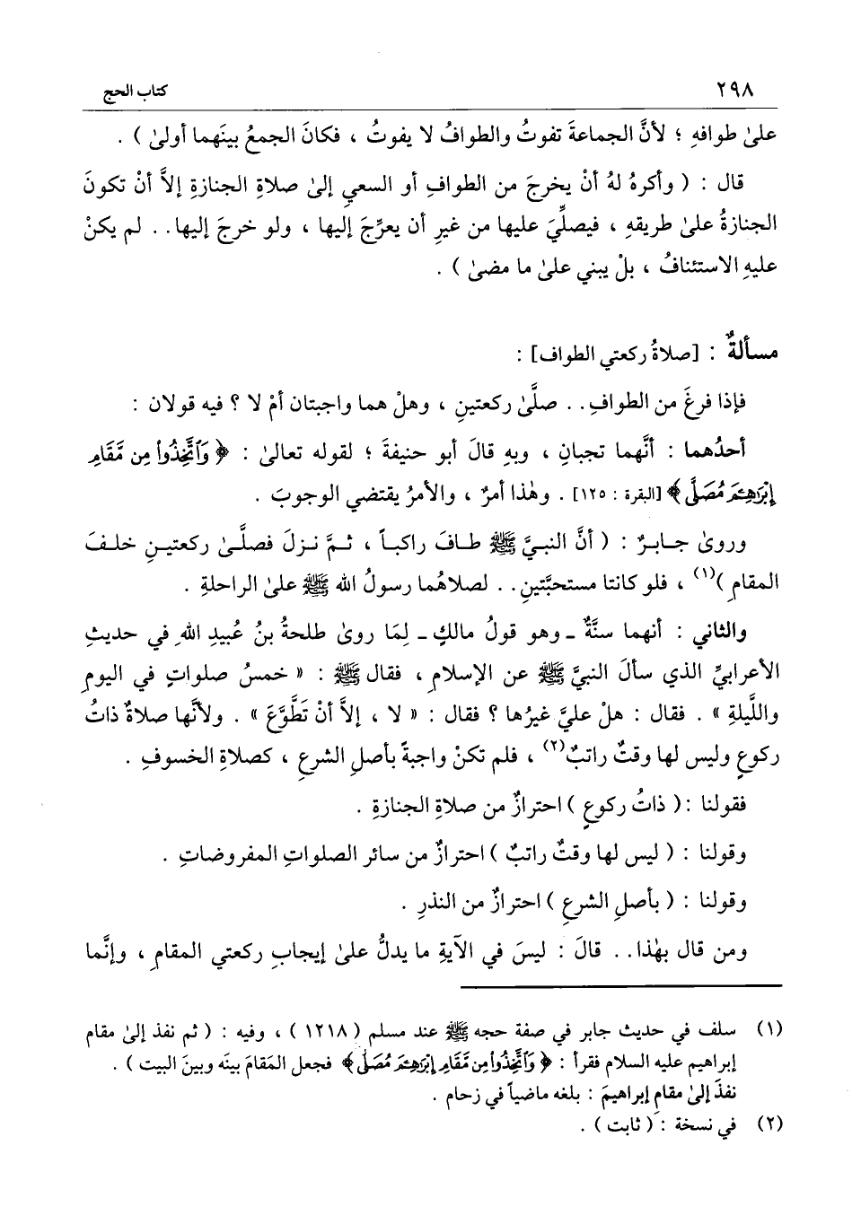 وروى جابر: «أن النبي ـ - صَلَّى اللَّهُ عَلَيْهِ وَسَلَّمَ - ـ طاف راكبا، ثم نزل فصلى ركعتين خلف المقام» فلو كانتا مستحبتين.. لصلاهما رسول الله ـ - صَلَّى اللَّهُ عَلَيْهِ وَسَلَّمَ - ـ على الراحلة.