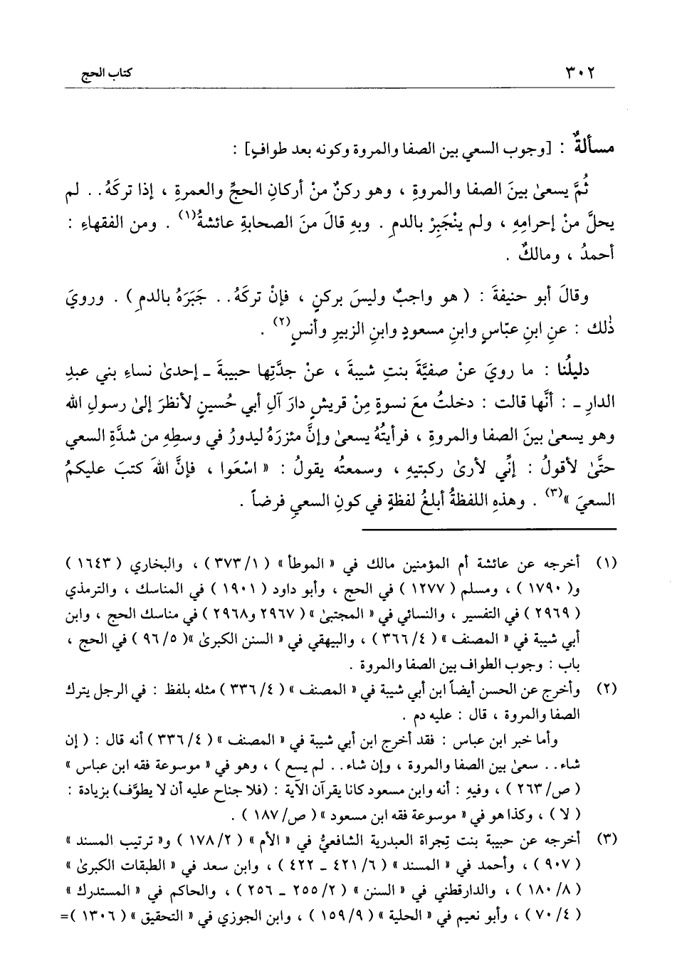 دليلنا: ما روي «عن صفية بنت شيبة، عن جدتها حبيبة ـ إحدى نساء بني عبد الدارـ: أنها قالت: دخلت مع نسوة من قريش دار آل أبي حسين لأنظر إلى رسول الله وهو يسعى بين الصفا والمروة، فرأيته يسعى وإن مئزره ليدور في وسطه من شدة السعي حتى لأقول: إني لأرى ركبتيه، وسمعته يقول: " اسعوا، فإن الله كتب عليكم السعي» . وهذه اللفظة أبلغ لفظة في كون السعي فرضا.