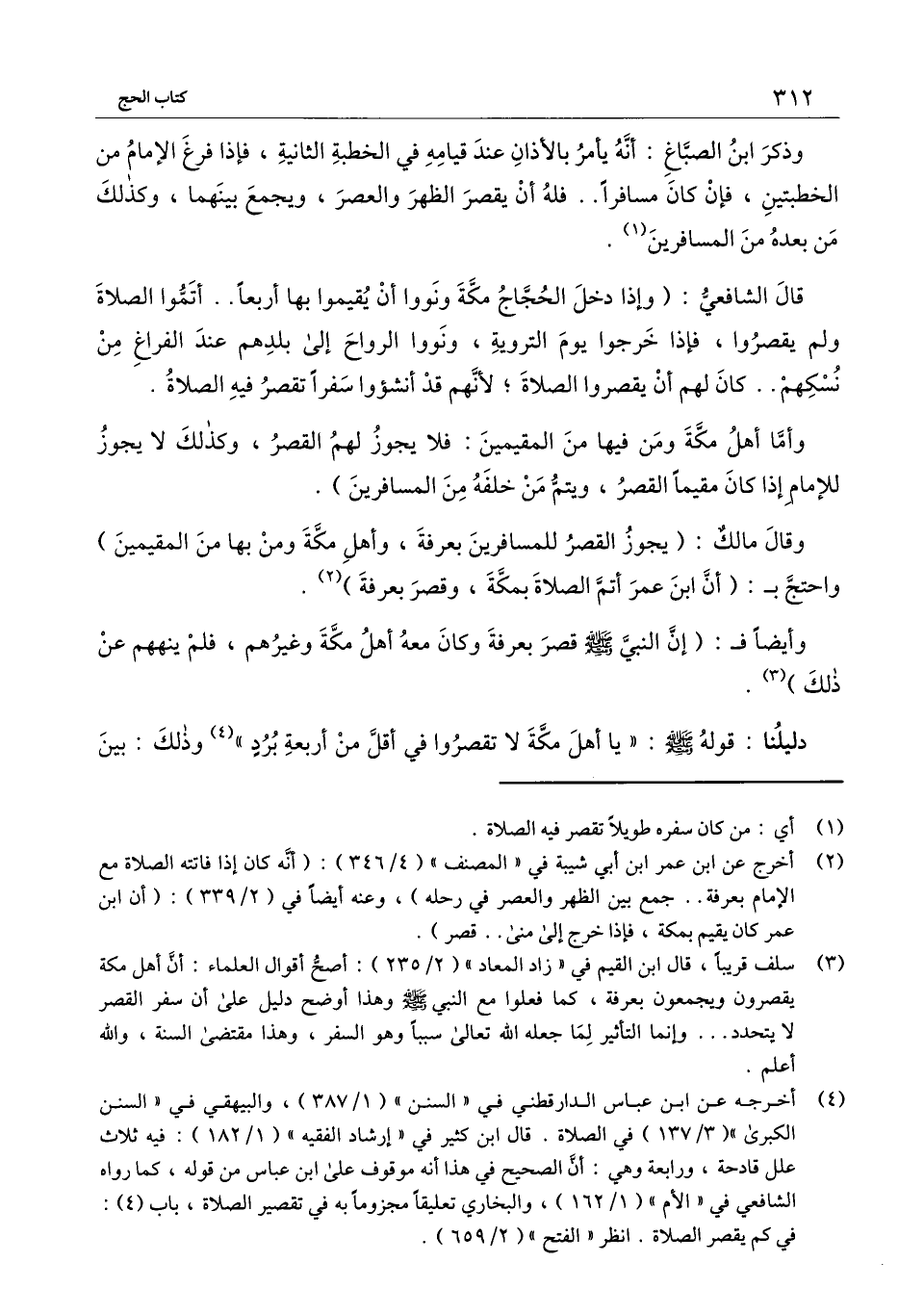 قال الشافعي: (وإذا دخل الحجاج مكة ونووا أن يقيموا بها أربعا.. أتموا الصلاة ولم يقصروا، فإذا خرجوا يوم التروية، ونووا الرواح إلى بلدهم عند الفراغ من نسكهم.. كان لهم أن يقصروا الصلاة؛ لأنهم قد أنشئوا سفرا تقصر فيه الصلاة.