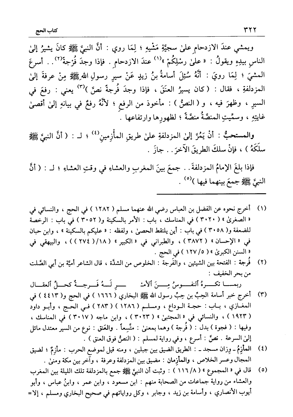 ويمشي عند الازدحام على سجية مشيه؛ لما روي: «أن النبي ـ - صَلَّى اللَّهُ عَلَيْهِ وَسَلَّمَ - ـ كان يشير إلى الناس بيده ويقول: " على رسلكم " عند الازدحام. فإذا وجد فرجة.. أسرع المشي؛» لما روي: أنه «سئل أسامة بن زيد عن سير رسول الله ـ - صَلَّى اللَّهُ عَلَيْهِ وَسَلَّمَ - ـ من عرفة إلى المزدلفة، فقال: (كان يسير العَنَق، فإذا وجد فرجة نصَّ» يعني: رفع في السير، وظهر فيه، و (النص) : مأخوذ من الرفع؛ لأنه رفع في بيانه إلى أقصى غايته، وسميت المنصة منصة؛ لظهورها وارتفاعها.