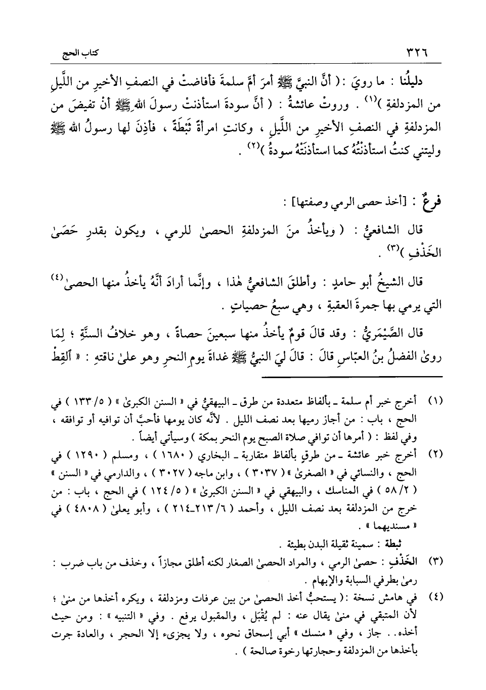 دليلنا: ما روي: «أن النبي ـ - صَلَّى اللَّهُ عَلَيْهِ وَسَلَّمَ - ـ أمر أم سلمة فأفاضت في النصف الأخير من الليل من المزدلفة» . وروت عائشة: «أن سودة استأذنت رسول الله ـ - صَلَّى اللَّهُ عَلَيْهِ وَسَلَّمَ - ـ أن تفيض من المزدلفة في النصف الأخير من الليل، وكانت امرأة ثبطة، فأذن لها رسول الله ـ - صَلَّى اللَّهُ عَلَيْهِ وَسَلَّمَ - ـ وليتني كنت استأذنته كما استأذنته سودة» .