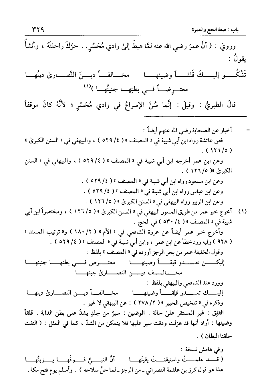 وروي: (أن عمر ـ - رَضِيَ اللَّهُ عَنْهُ - ـ لما هبط إلى وادي محسر ... حرك راحلته، وأنشأ يقول: