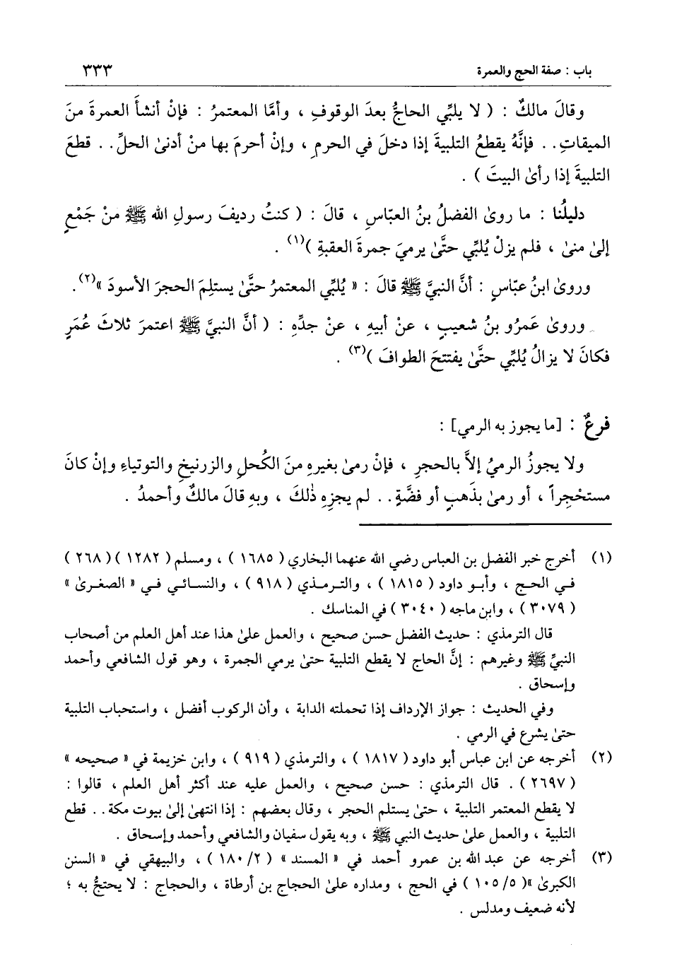 وروى ابن عباس: أن النبي ـ - صَلَّى اللَّهُ عَلَيْهِ وَسَلَّمَ - ـ قال: «يلبي المعتمر حتى يستلم الحجر الأسود» .