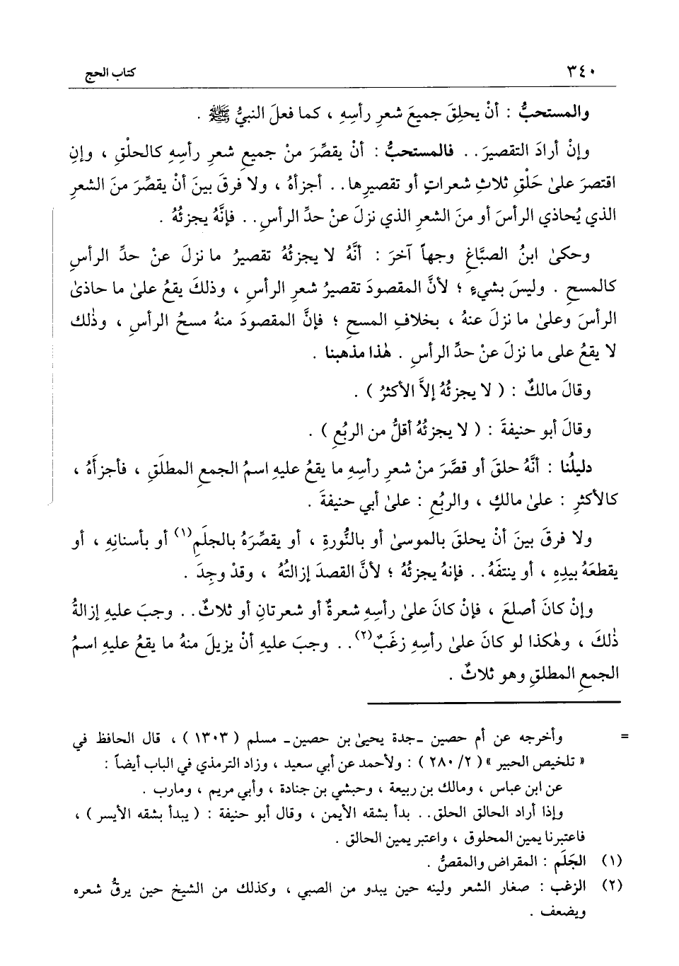 والمستحب: أن يحلق جميع شعر رأسه، كما فعل النبي ـ - صَلَّى اللَّهُ عَلَيْهِ وَسَلَّمَ - ـ.