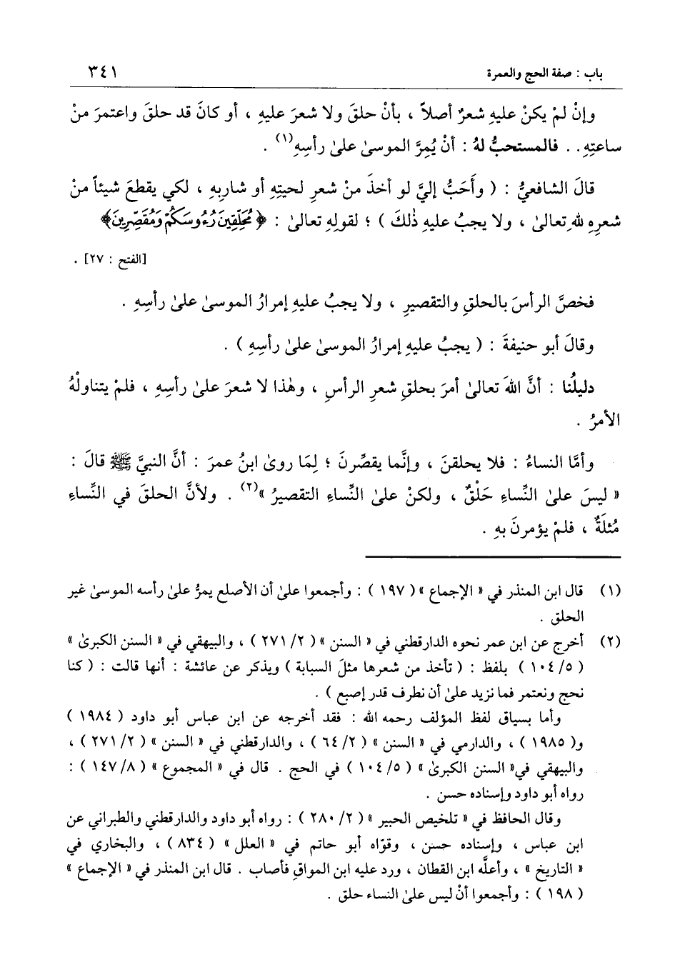وأما النساء: فلا يحلقن، وإنما يقصرن؛ لما روى ابن عمر: أن النبي ـ - صَلَّى اللَّهُ عَلَيْهِ وَسَلَّمَ - ـ قال: «ليس على النساء حلق، ولكن على النساء التقصير» . ولأن الحلق في النساء مثلة، فلم يؤمرن به.