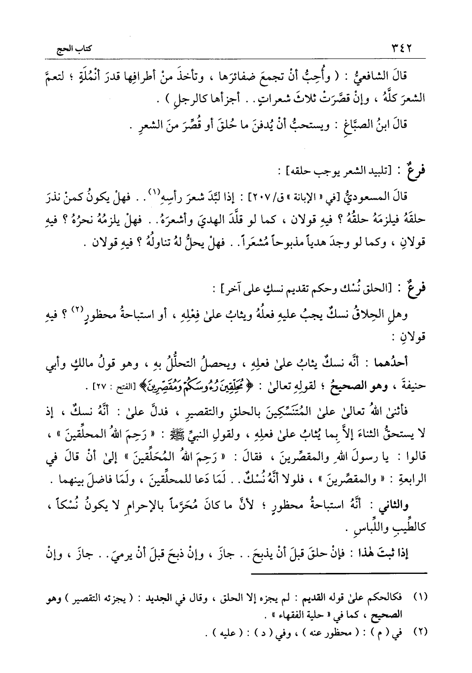 أحدهما: أنه نسك يثاب على فعله، ويحصل التحلل به، وهو قول مالك وأبي حنيفة، وهو الصحيح؛ لِقَوْلِهِ تَعَالَى: {مُحَلِّقِينَ رُءُوسَكُمْ وَمُقَصِّرِينَ} [الفتح: 27] [الفتح: 27] .