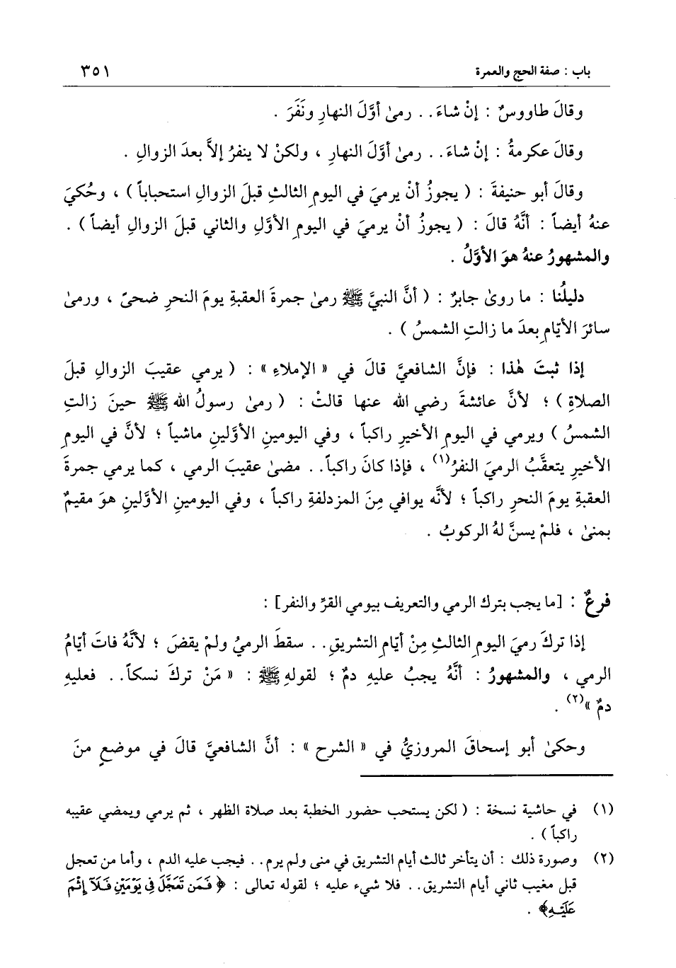 الرمي والتعريف بيومي القر والنفر الرمي والتعريف بيومي القر والنفر] : إذا ترك رمي اليوم الثالث من أيام التشريق.. سقط الرمي ولم يقض؛ لأنه فات أيام الرمي، والمشهور: أنه يجب عليه دم؛ لقوله ـ - صَلَّى اللَّهُ عَلَيْهِ وَسَلَّمَ - ـ: «من ترك نسكا.. فعليه دم»