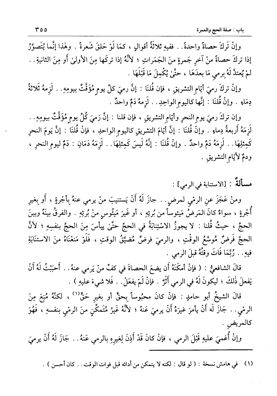 ] : ومن عجز عن الرمي لمرض.. جاز له أن يستنيب من يرمي عنه بأجرة، أو بغير أجرة، سواء كان المرض ميئوسا من برئه، أو غير ميئوس من برئه. والفرق بينه وبين الحج، حيث قلنا: لا يجوز الاستنابة في الحج حتى ييأس من الحج بنفسه؛ لأن الحج فرض موسع الوقت، والرمي فرض مضيق الوقت، فلو منعناه من الاستنابة فيه.. ربما فات وقته قبل الرمي.