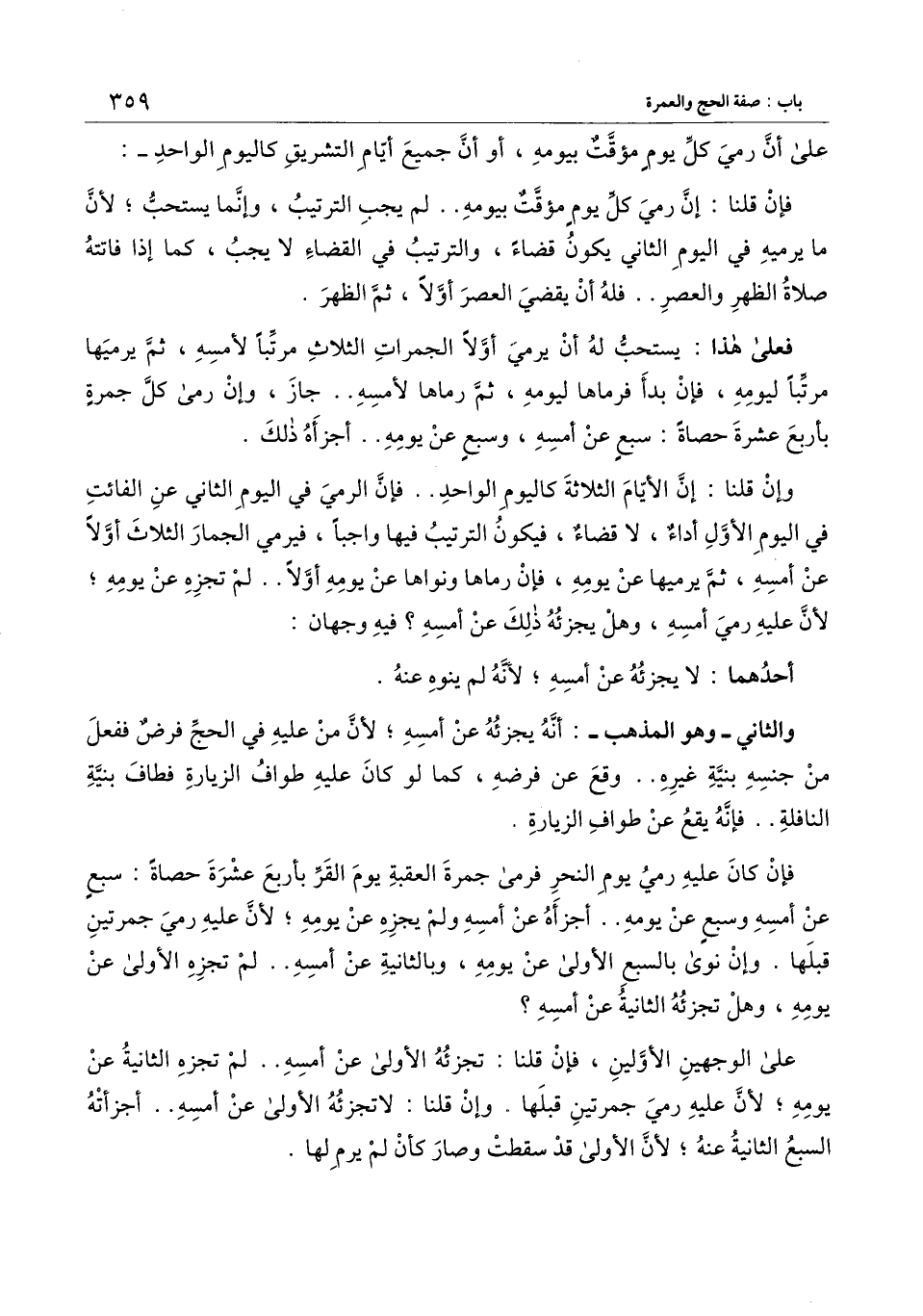 والثاني ـ وهو المذهب ـ: أنه يجزئه عن أمسه؛ لأن من عليه في الحج فرض ففعل من جنسه بنية غيره.. وقع عن فرضه، كما لو كان عليه طواف الزيارة فطاف بنية النافلة.. فإنه يقع عن طواف الزيارة.