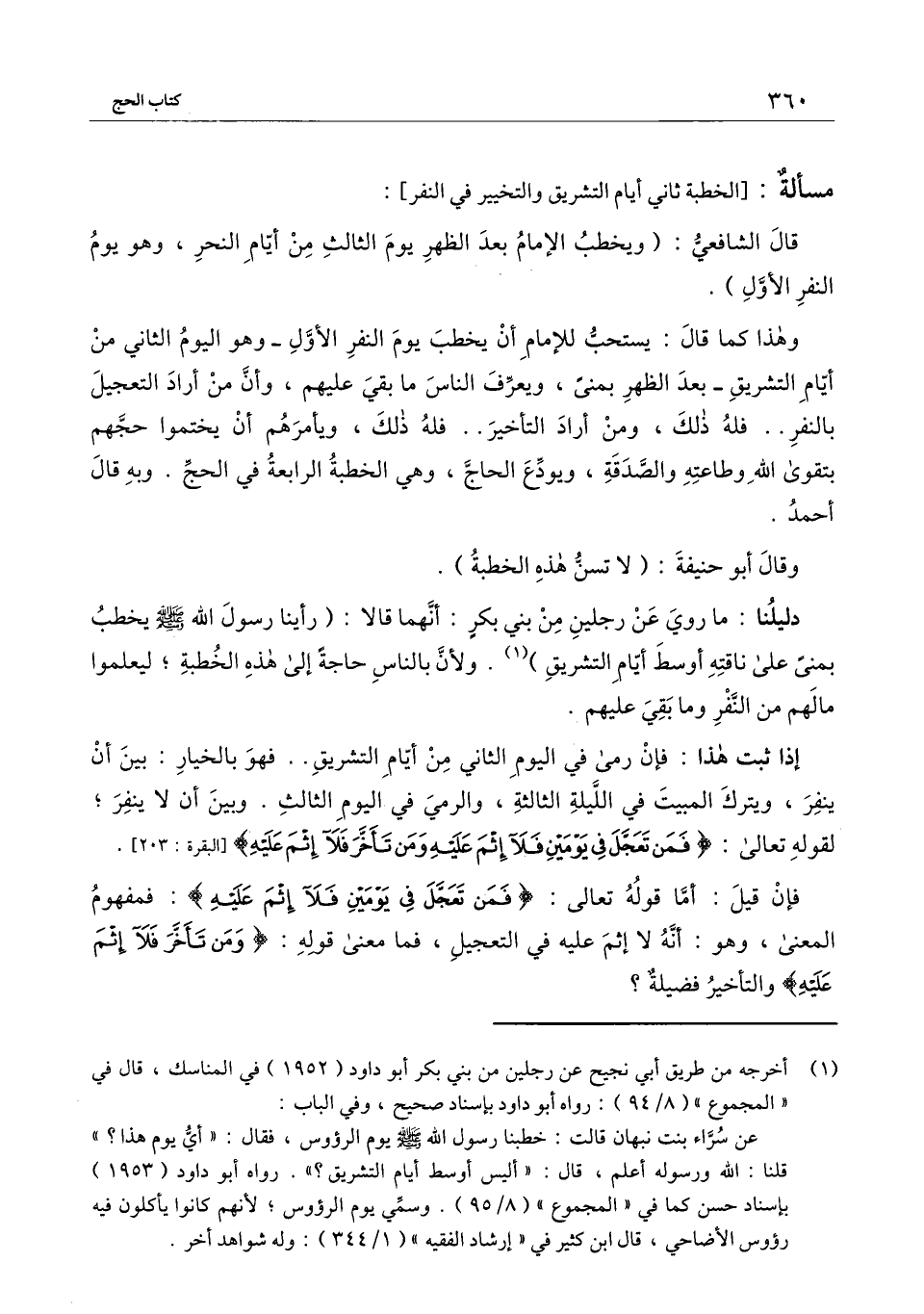 وهذا كما قال: يستحب للإمام أن يخطب يوم النفر الأول ـ وهو اليوم الثاني من أيام التشريق ـ بعد الظهر بمنى، ويعرف الناس ما بقي عليهم، وأن من أراد التعجيل بالنفر.. فله ذلك، ومن أراد التأخير.. فله ذلك، ويأمرهم أن يختموا حجهم بتقوى الله وطاعته والصدقة، ويودع الحاج، وهي الخطبة الرابعة في الحج. وبه قال أحمد.