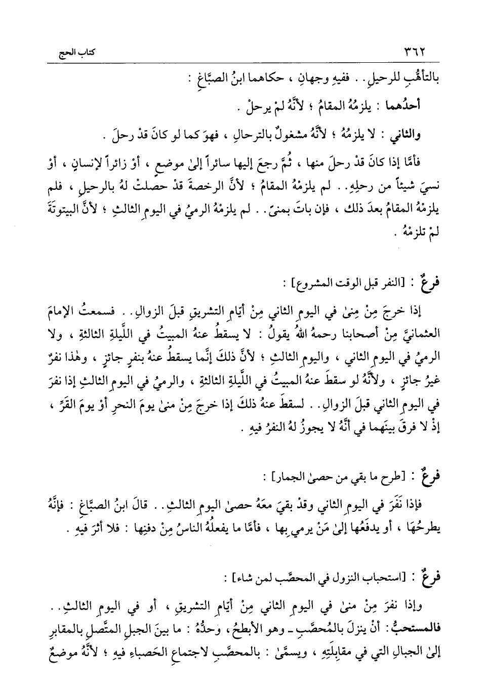 ] : إذا خرج من منى في اليوم الثاني من أيام التشريق قبل الزوال.. فسمعت الإمام العثماني من أصحابنا - رَحِمَهُ اللَّهُ - يقول: لا يسقط عنه المبيت في الليلة الثالثة، ولا الرمي في اليوم الثاني، واليوم الثالث؛ لأن ذلك إنما يسقط عنه بنفر جائز، وهذا نفر غير جائز، ولأنه لو سقط عنه المبيت في الليلة الثالثة، والرمي في اليوم الثالث إذا نفر في اليوم الثاني قبل الزوال.. لسقط عنه ذلك إذا خرج من منى يوم النحر أو يوم القر، إذ لا فرق بينهما في أنه لا يجوز له النفر فيه.