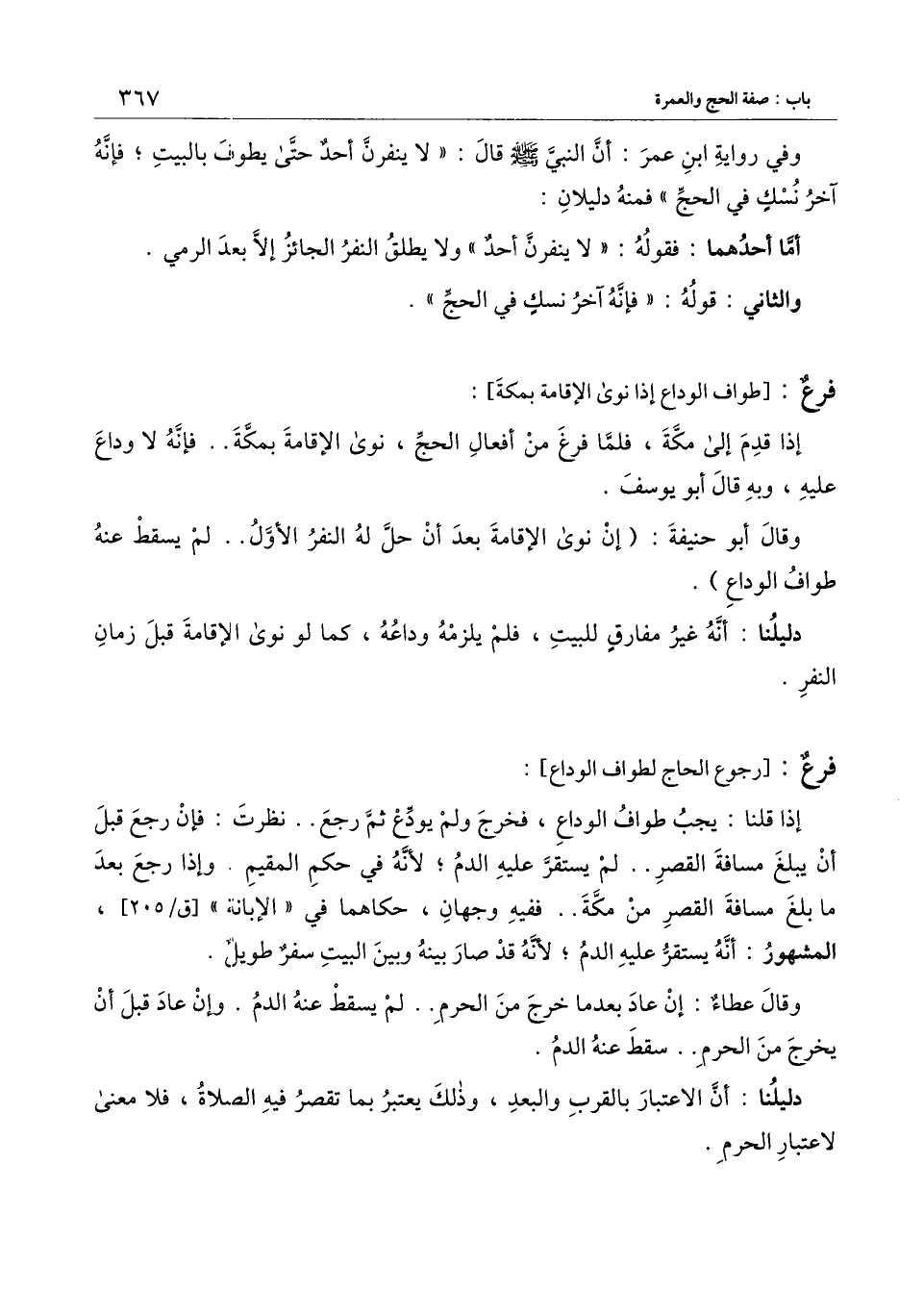 وفي رواية ابن عمر: أن النبي ـ - صَلَّى اللَّهُ عَلَيْهِ وَسَلَّمَ - قال: «لا ينفرن أحد حتى يطوف بالبيت؛ فإنه آخر نسك في الحج» فمنه دليلان: