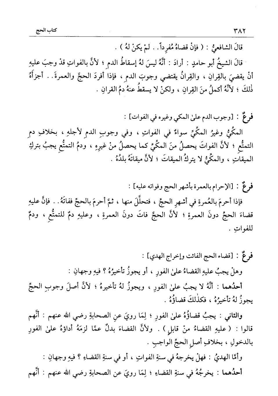 قال الشيخ أبو حامد: أراد: أنه ليس له إسقاط الدم؛ لأن بالفوات قد وجب عليه أن يقضي بالقران، والقران يقتضي وجوب الدم، فإذا أفرد الحج والعمرة.. أجزأه ذلك؛ لأنه أكمل من القران، ولكن لا يسقط عنه دم القران.