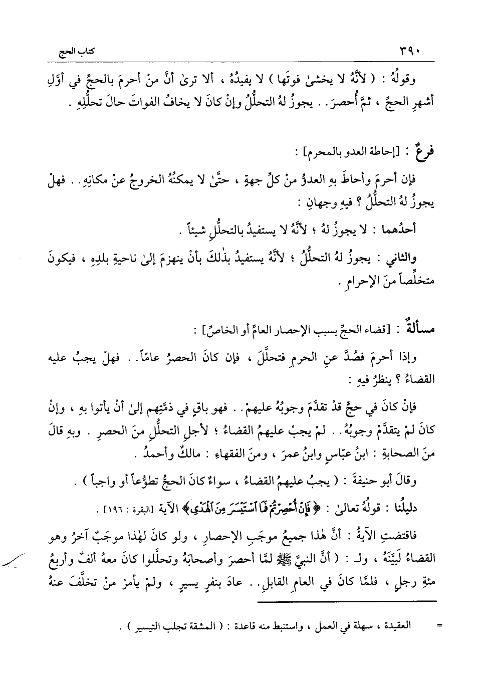 وقوله: (لأنه لا يخشى فوتها) لا يفيده، ألا ترى أن من أحرم بالحج في أول أشهر الحج، ثم أحصر يجوز له التحلل وإن كان لا يخاف الفوات حال تحلله.