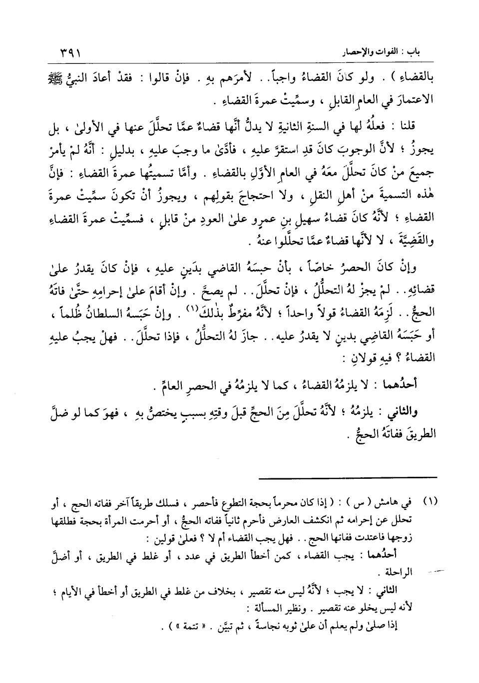 قلنا: فعله لها في السنة الثانية لا يدل أنها قضاء عما تحلل عنها في الأولى، بل يجوز؛ لأن الوجوب كان قد استقر عليه، فأدى ما وجب عليه، بدليل: أنه لم يأمر جميع من كان تحلل معه في العام الأول بالقضاء. وأما تسميتها عمرة القضاء: فإن هذه التسمية من أهل النقل، ولا احتجاج بقولهم، ويجوز أن تكون سميت عمرة القضاء؛ لأنه كان قضاء سهيل بن عمرو على العود من قابل، فسميت عمرة القضاء والقضية، لا لأنها قضاء عما تحللوا عنه.