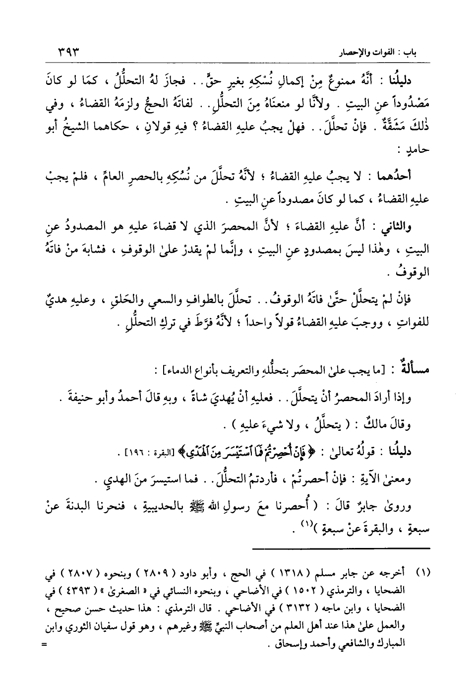دليلنا: أنه ممنوع من إكمال نسكه بغير حق فجاز له التحلل، كما لو كان مصدودا عن البيت. ولأنا لو منعناه من التحلل لفاته الحج ولزمه القضاء، وفي ذلك مشقة. فإن تحلل فهل يجب عليه القضاء؟ فيه قولان، حكاهما الشيخ أبو حامد: