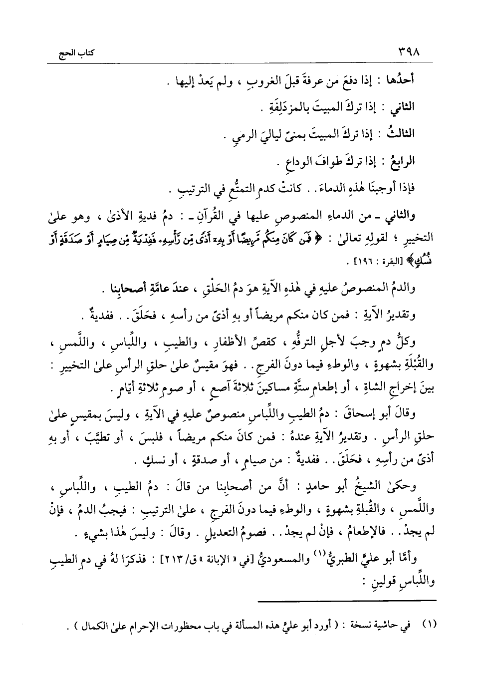 وقال أبو إسحاق: دم الطيب واللباس منصوص عليه في الآية، وليس بمقيس على حلق الرأس. وتقدير الآية عنده: فمن كان منكم مريضا، فلبس، أو تطيب، أو به أذى من رأسه، فحلق ففدية: من صيام، أو صدقة، أو نسك.