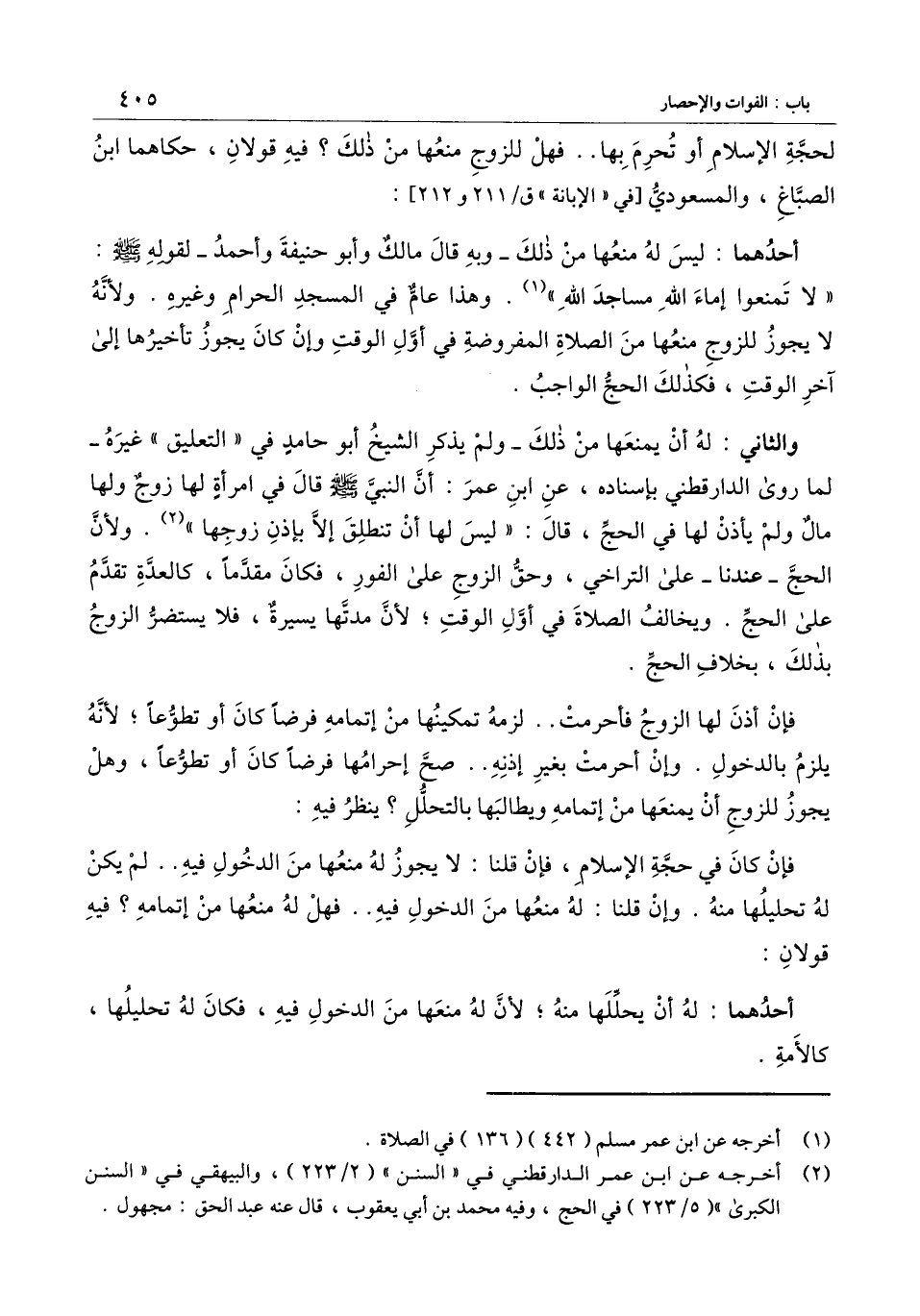 والثاني: له أن يمنعها من ذلك - ولم يذكر الشيخ أبو حامد في " التعليق " غيره - لما روى الدارقطني بإسناده، عن ابن عمر: «أن النبي - صَلَّى اللَّهُ عَلَيْهِ وَسَلَّمَ - قال في امرأة لها زوج ولها مال ولم يأذن لها في الحج، قال: " ليس لها أن تنطلق إلا بإذن زوجها» . ولأن الحج - عندنا - على التراخي، وحق الزوج على الفور، فكان مقدما، كالعدة تقدم على الحج. ويخالف الصلاة في أول الوقت؛ لأن مدتها يسيرة، فلا يستضر الزوج بذلك، بخلاف الحج. فإن أذن لها الزوج فأحرمت لزمه تمكينها من إتمامه فرضا كان أو تطوعا؛ لأنه يلزم بالدخول. وإن أحرمت بغير إذنه صح إحرامها فرضا كان أو تطوعا، وهل يجوز للزوج أن يمنعها من إتمامه ويطالبها بالتحلل؟ ينظر فيه: