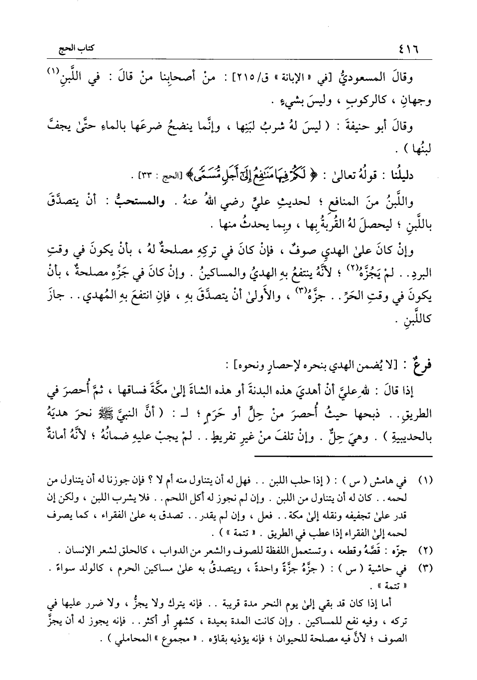 واللبن من المنافع لحديث علي - رَضِيَ اللَّهُ عَنْهُ -. والمستحب: أن يتصدق باللبن؛ ليحصل له القربة بها، وبما يحدث منها.