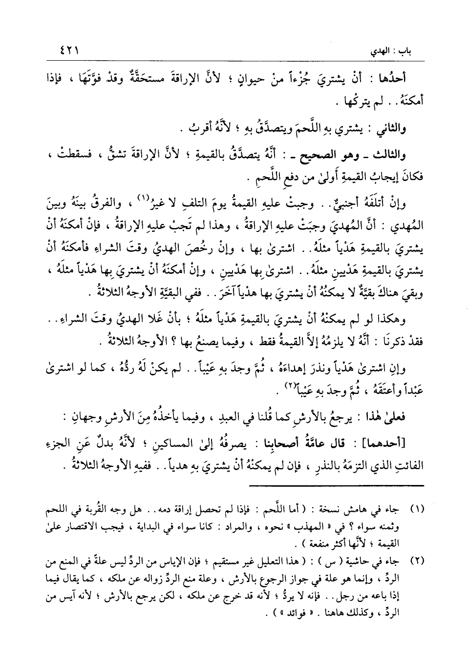والثالث - وهو الصحيح -: أنه يتصدق بالقيمة؛ لأن الإراقة تشق، فسقطت فكان إيجاب القيمة أولى من دفع اللحم.