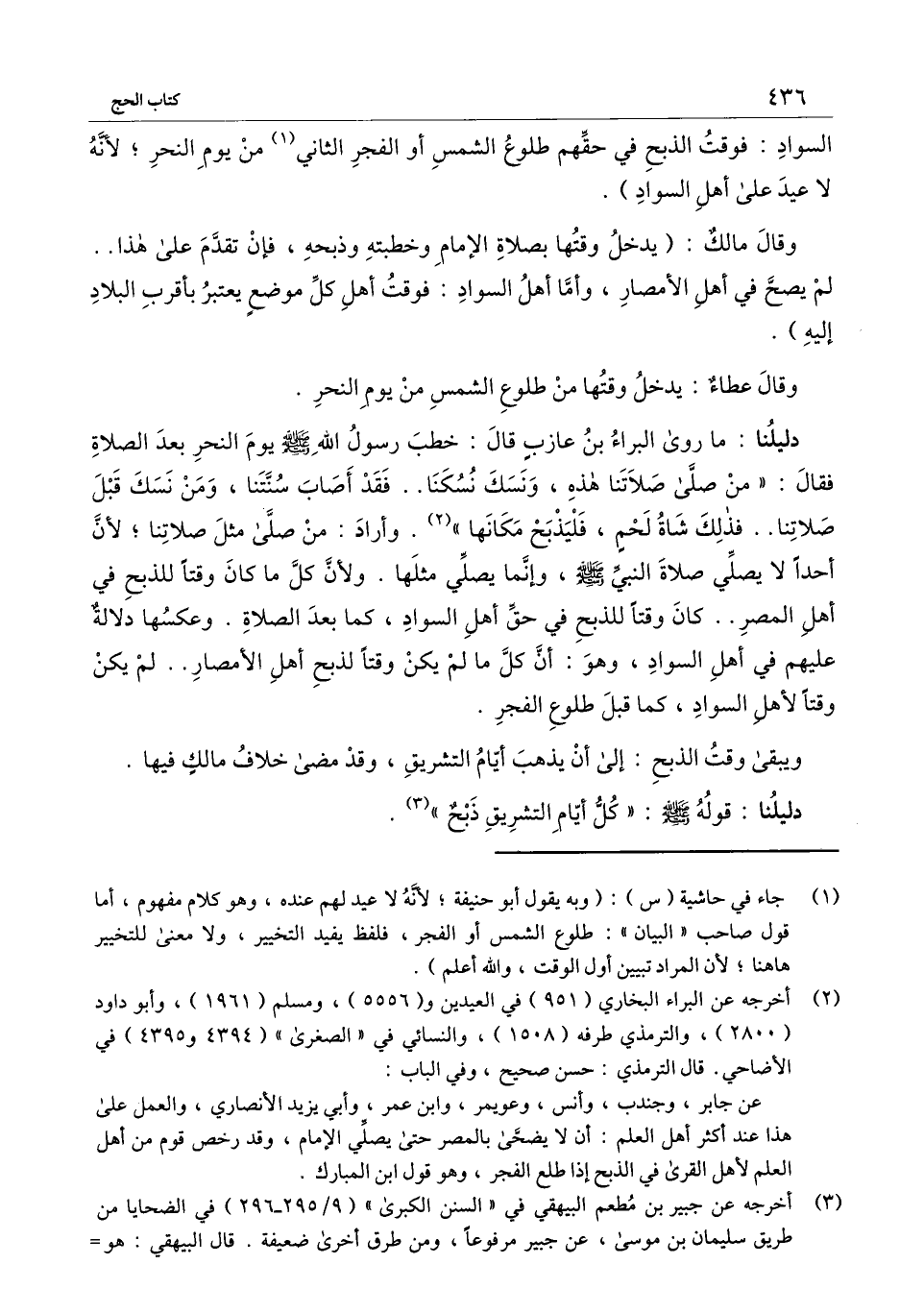 السواد: فوقت الذبح في حقهم طلوع الشمس أو الفجر الثاني من يوم النحر؛ لأنه لا عيد على أهل السواد) .