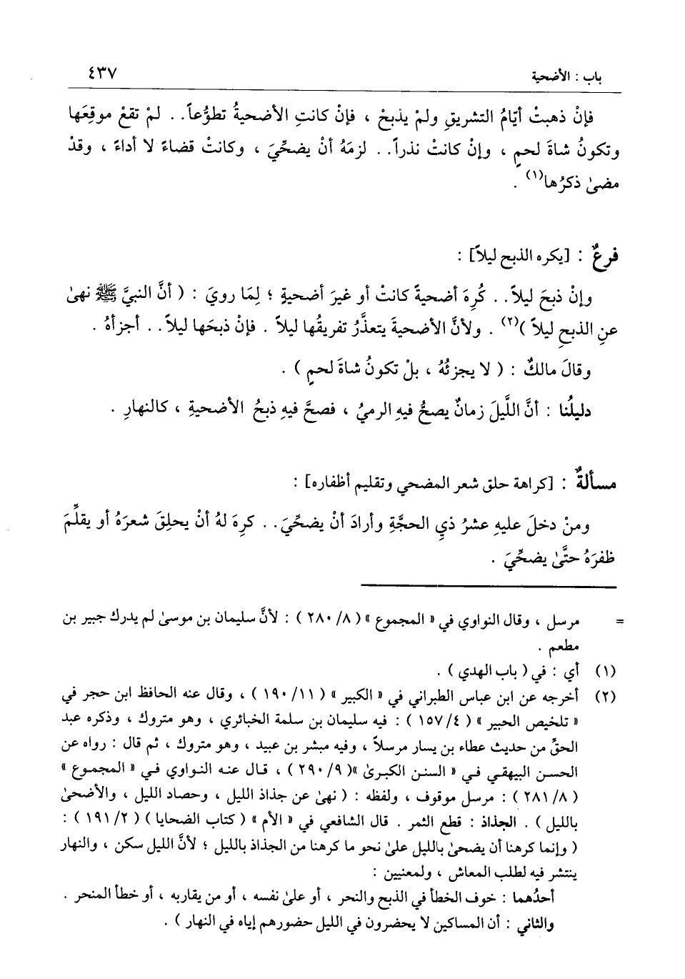 ] : وإن ذبح ليلا كره أضحية كانت أو غير أضحية؛ لما روي: «أن النبي - صَلَّى اللَّهُ عَلَيْهِ وَسَلَّمَ - نهى عن الذبح ليلا» . ولأن الأضحية يتعذر تفريقها ليلا. فإن ذبحها ليلا أجزأه.
