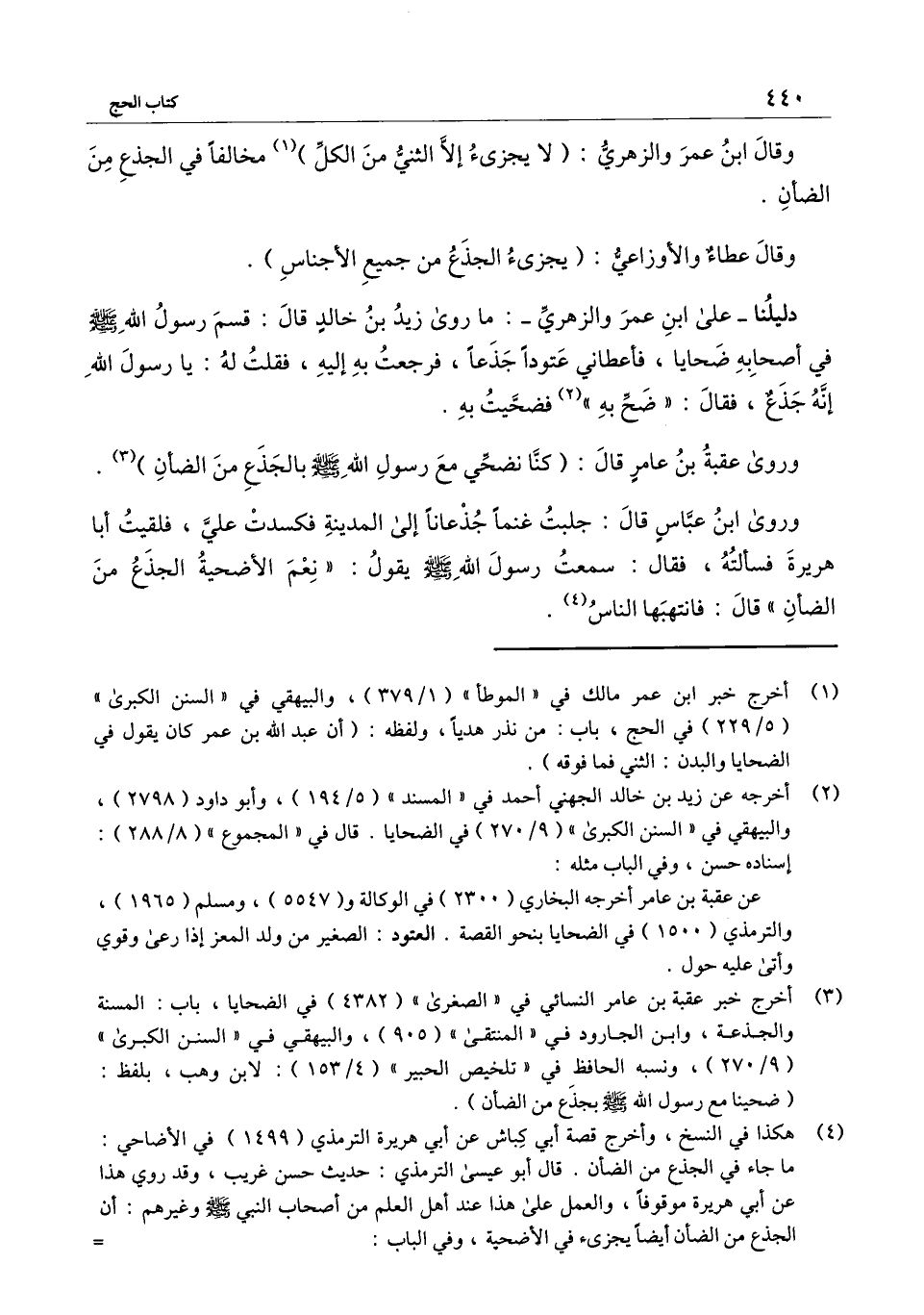 «وروى ابن عباس قال: جلبت غنما جذعانا إلى المدينة فكسدت علي، فلقيت أبا هريرة فسألته، فقال: سمعت رسول الله - صَلَّى اللَّهُ عَلَيْهِ وَسَلَّمَ - يقول: " نعم الأضحية الجذع من الضأن "، قال: فانتهبها الناس» .