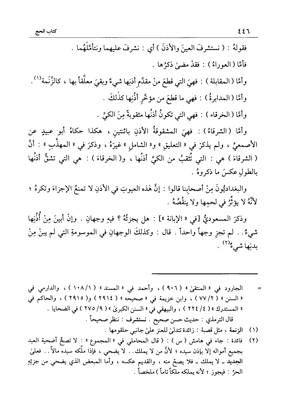 والبغداديون من أصحابنا قالوا: إن هذه العيوب في الأذن لا تمنع الإجزاء وتكره؛ لأنه لا يؤثر في لحمها ولا ينقصه.