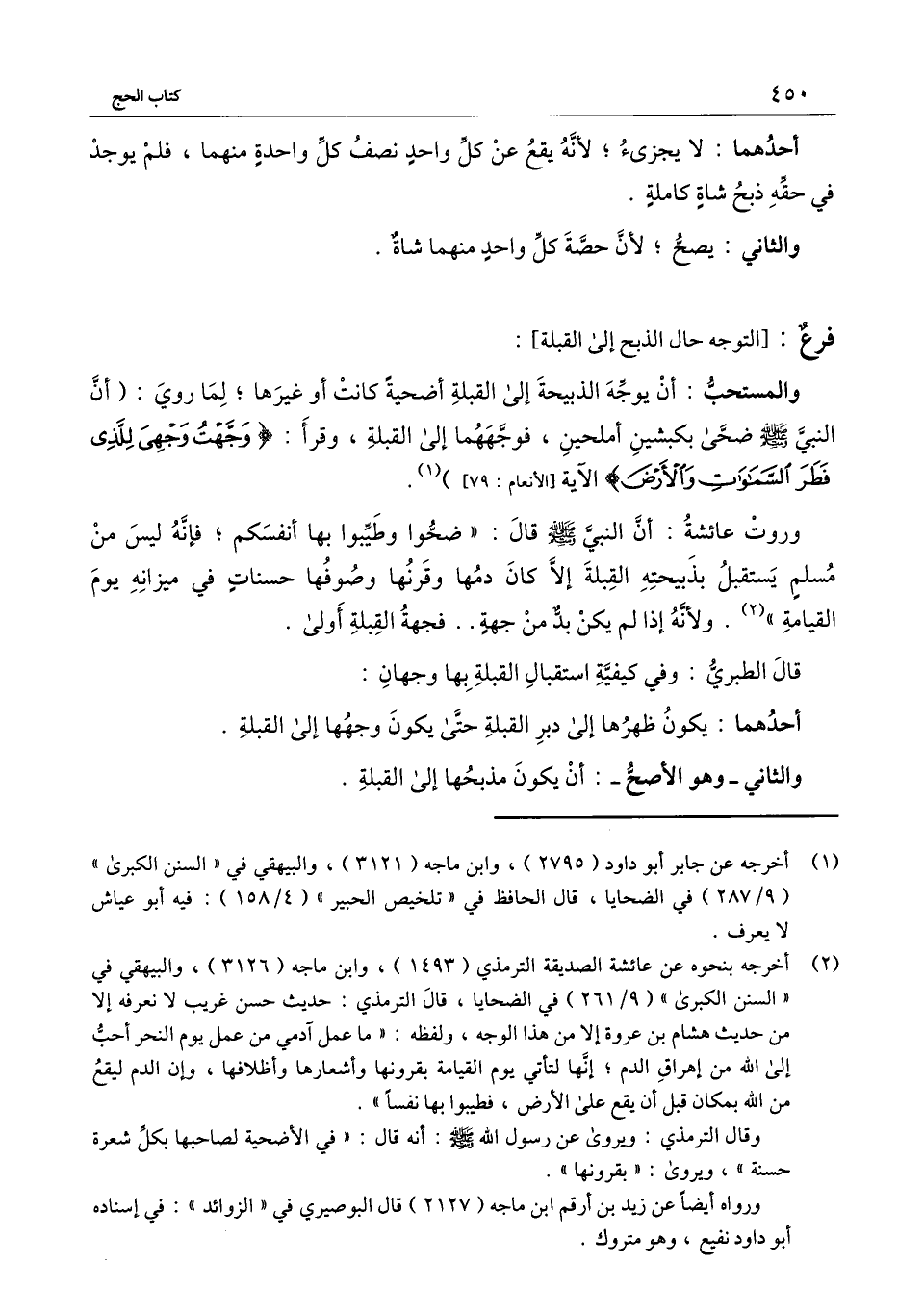 ] . والمستحب: أن يوجه الذبيحة إلى القبلة أضحية كانت أو غيرها؛ لما روي: «أن النبي - صَلَّى اللَّهُ عَلَيْهِ وَسَلَّمَ - ضحى بكبشين أملحين، فوجههما إلى القبلة، وقرأ: {وَجَّهْتُ وَجْهِيَ لِلَّذِي فَطَرَ السَّمَاوَاتِ وَالأَرْضَ} [الأنعام: 79] » الآية [الأنعام: 79] ) .