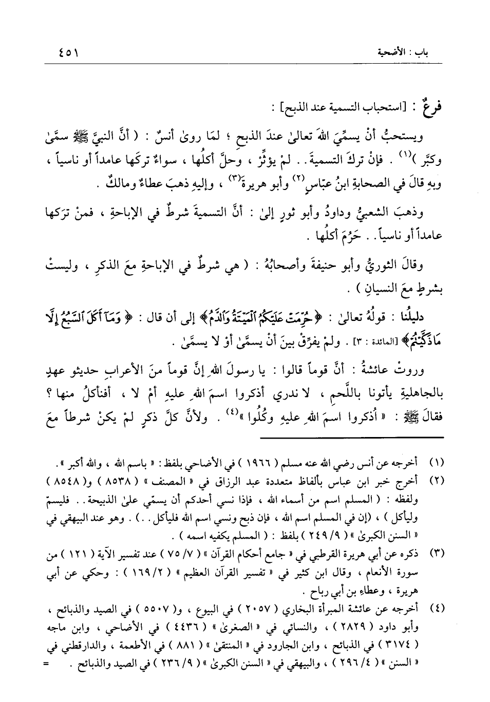 ] : ويستحب أن يسمي الله تعالى عند الذبح؛ لما روى أنس: (أن النبي - صَلَّى اللَّهُ عَلَيْهِ وَسَلَّمَ - سمى وكبر) . فإن ترك التسمية لم يؤثر، وحل أكلها، سواء تركها عامدا أو ناسيا، وبه قال في الصحابة ابن عباس وأبو هريرة، وإليه ذهب عطاء ومالك.
