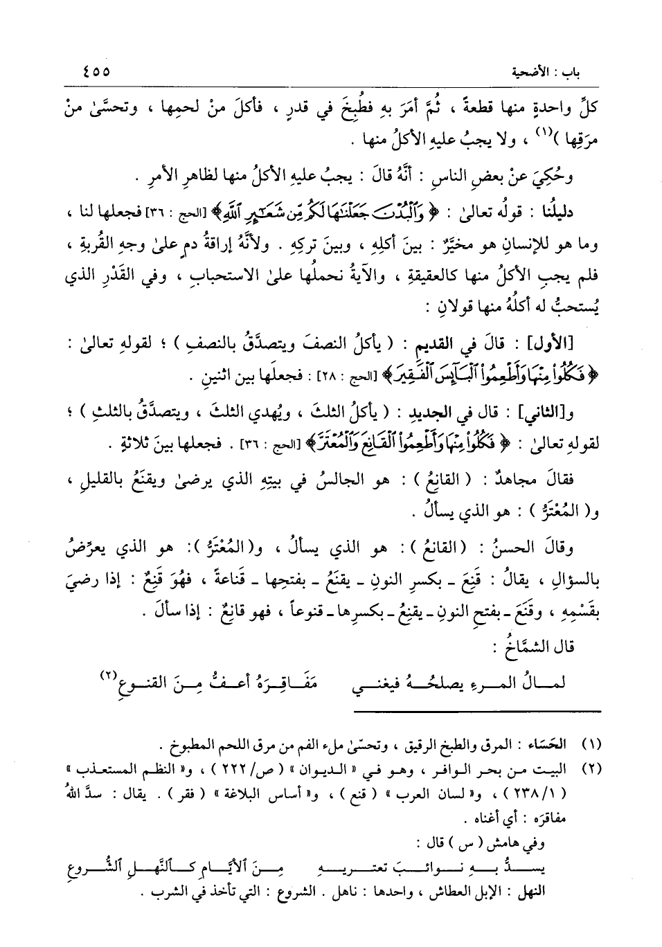 وقال الحسن: (القانع) : هو الذي يسأل، و (المعتر) : هو الذي يعرض بالسؤال، يقال: قنع - بكسر النون - يقنع - بفتحها - قناعة، فهو قنع إذا رضي بقسمه، وقنع - بفتح النون - يقنع - بكسرها - قنوعا، فهو قانع: إذا سأل.