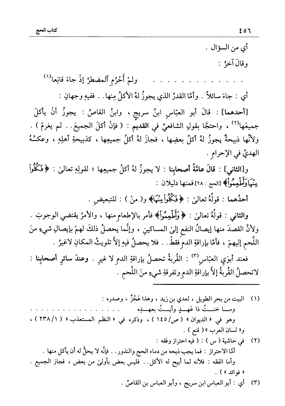والثاني: قَوْله تَعَالَى: {وَأَطْعِمُوا} [الحج: 28] فأمر بالإطعام منها، والأمر يقتضي الوجوب.