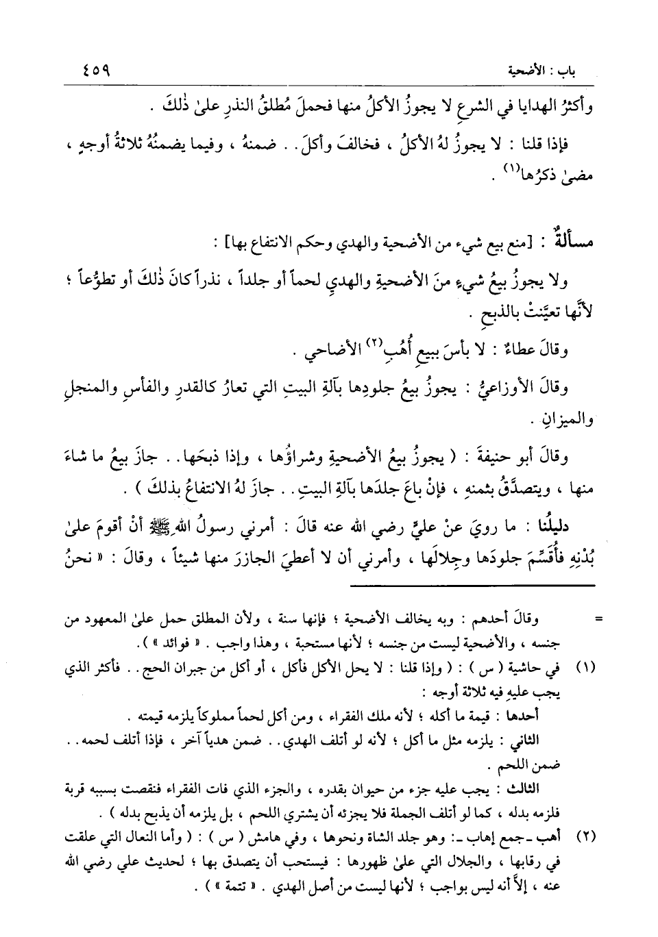 ] : ولا يجوز بيع شيء من الأضحية والهدي لحما أو جلدا، نذرا كان ذلك أو تطوعا لأنها تعينت بالذبح.